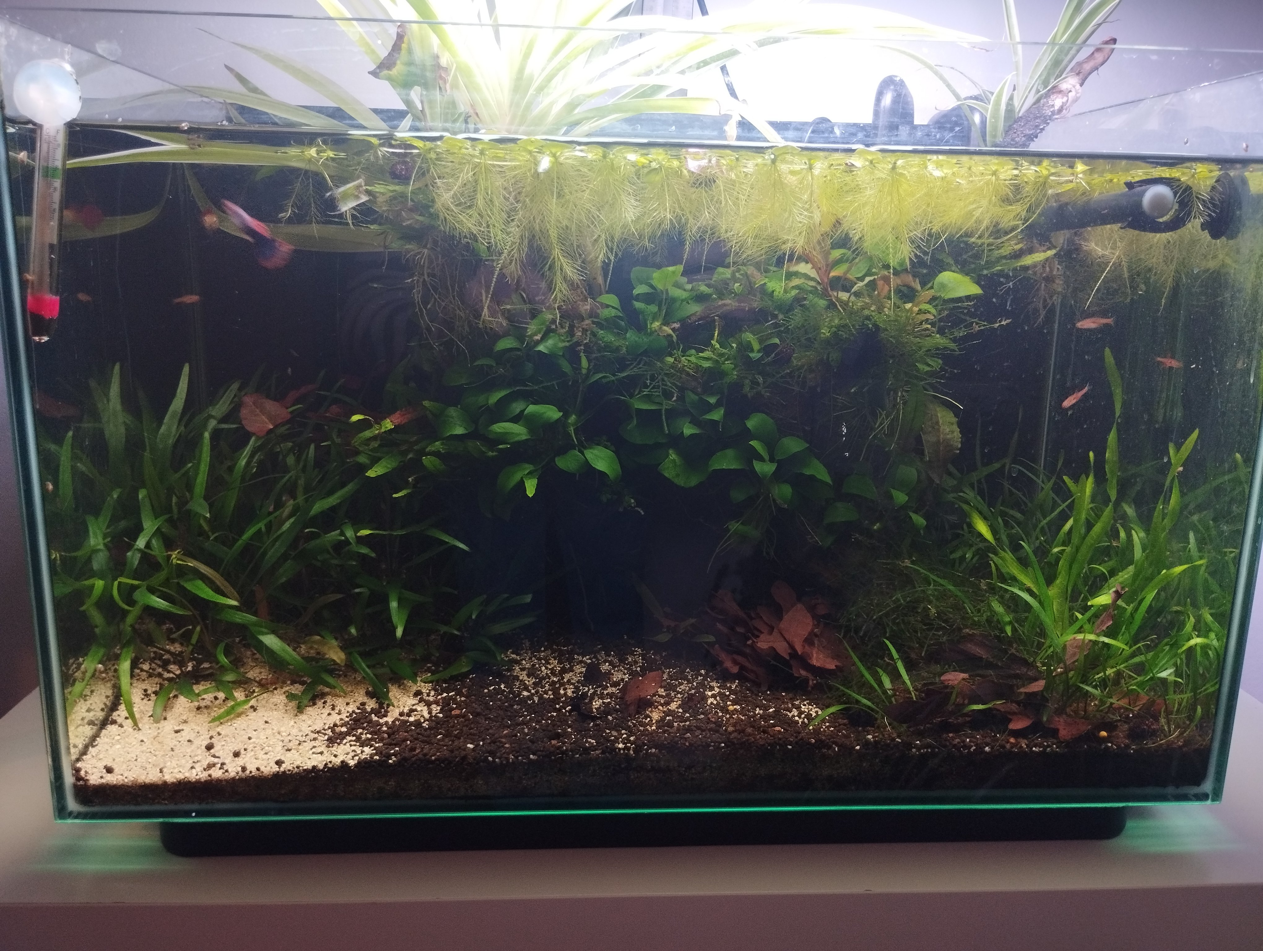 Voor de rest gaat het goed hier en daar wat groene draadalg, groene aanslag op de ruiten etc. Paar visjes wel gestorven 2x oto 2x guppy en 2x ringbandsnoek maar voor de rest gaat het uitstekend.