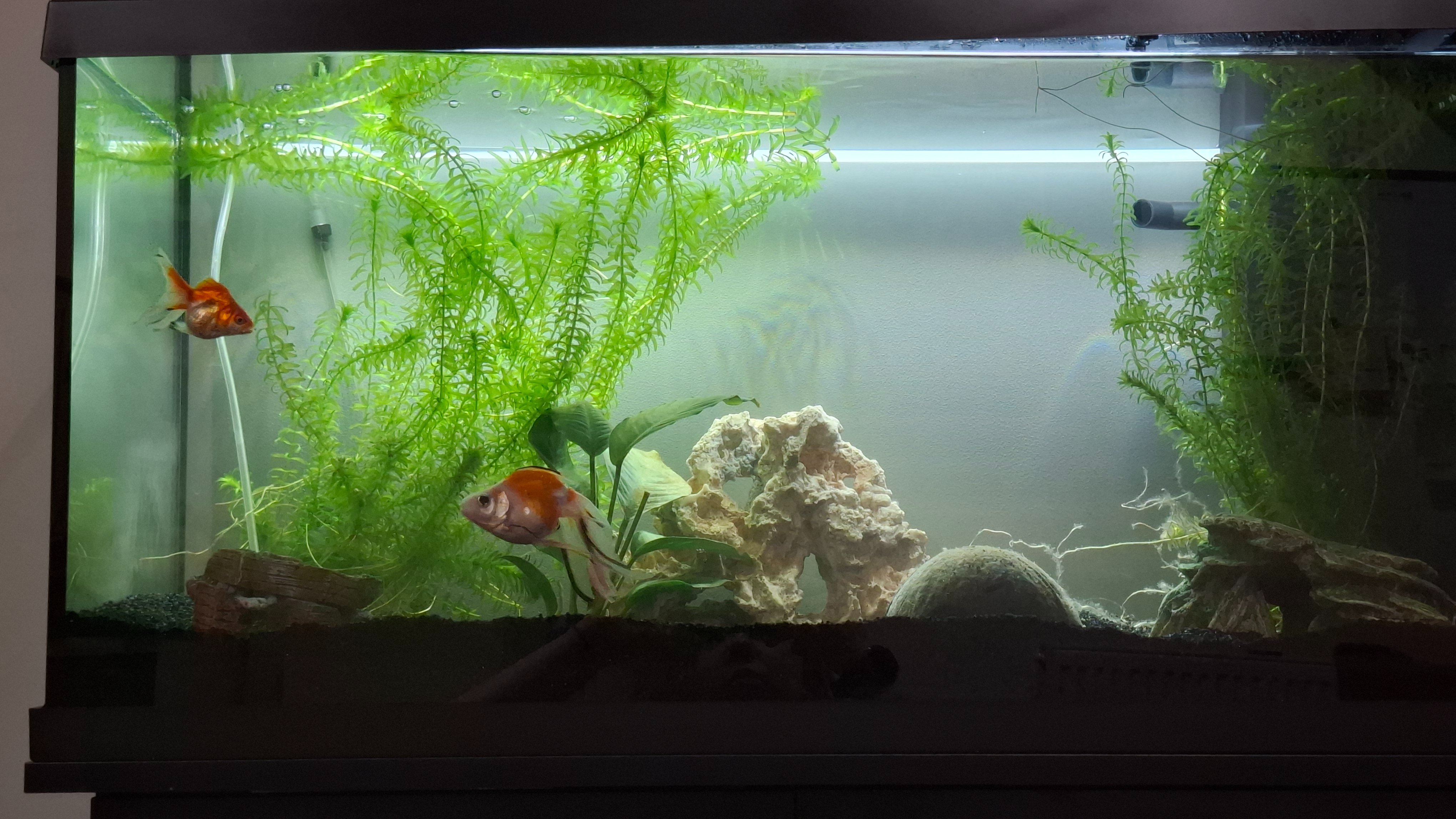 Hi, ik heb een update. Ik heb zondag me nieuwe bak ( juwel 110 2.0) op gehaald, opgezet en de sluierstaarten overgezet. Oude sponzen in het nieuwe filter gezet en 30l~40l van het oude water gebruikt en de rest vers gedaan. Ze zijn beide lekker actief 🙂