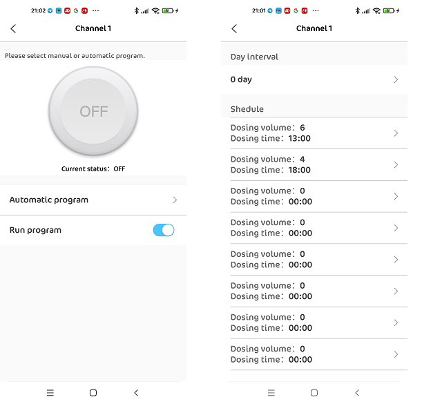 Je hebt dan de mogelijkheid om handmatig voeding toe te voegen, via de app (linker screenshot). Je drukt op de button (waar nu OFF staat) en dan gaat de pomp lopen. Druk je nog een keer op de button dan stopt de pomp weer.