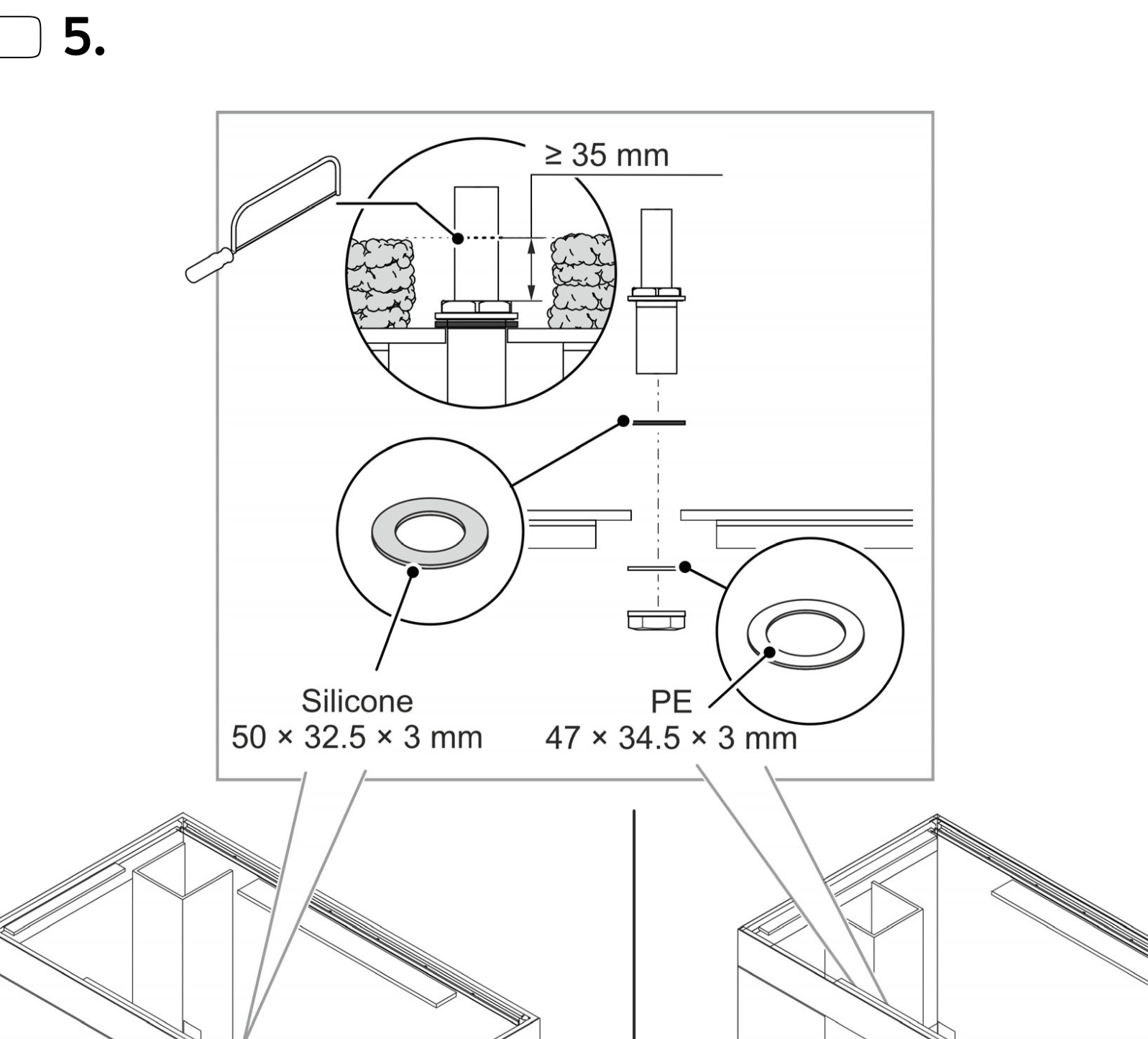 Maar de bodemdoorvoer heeft dezelfde buitenmaat als een 25 mm pvc ‘witlof doorvoer’ waar je dus een 25 mm pvc buis doorheen kunt schuiven en met wartel vast klemt.
