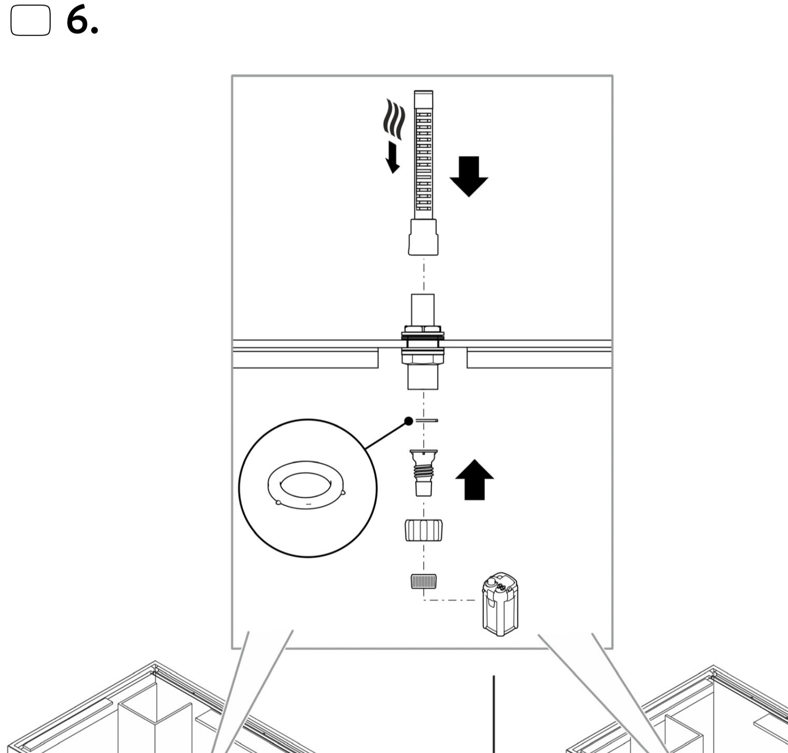 Door de droogkamer gaan 2 pvc leidingen. 1 25mm voor het gezuiverde water van de 2 filters. En 1 20mm leiding voor te vullen met vers water.