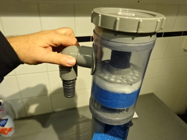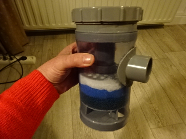 De filterwatten lijken toch het debiet snel te verminderen dus die hele pot zou dan voor een fatsoenljk onderhoudsinterval niet lekker werken tenzij die grof groter wordt en dat is lastig met PVC.