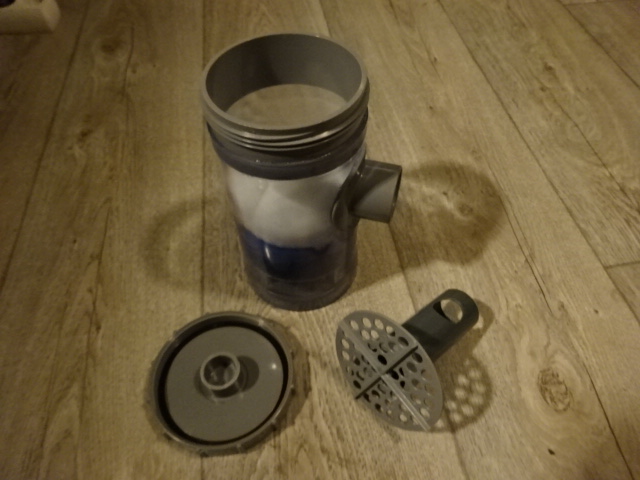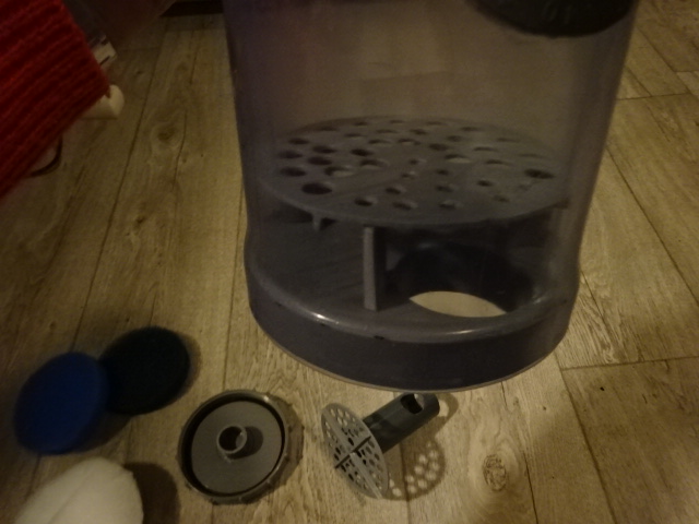 Als ik de FX6 uitzet en de schroefdop eraf haal dan komt de wattenfilter droog te liggenen de blauwe fijnschuim gedeeltelijk geloof ik.Niet echt helemaal doorgemeten want tijdens het knutselen wat kleine wijzigingen aangebracht met die diffusor platen in de pot. Het blauwe fijnschuim zit er voornamelijk in om de stroming van de 40mm buis te spreiden zodat de filterwatten niet kapot gaan. En ook om het fijnere vuil wat door de mediazak gaat (wat om de grote blauwe blokken zit) nog extra eruit te filteren voor dat de polijstwatten in gaat.