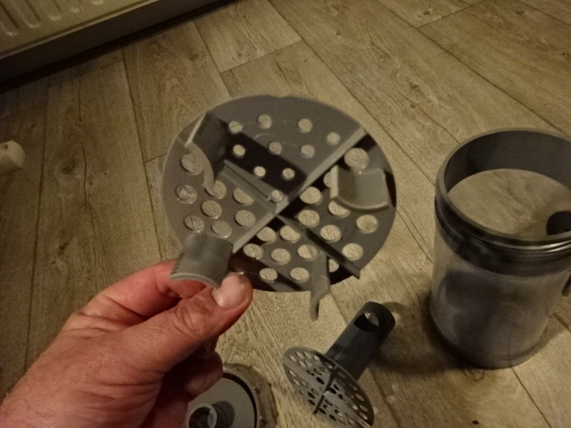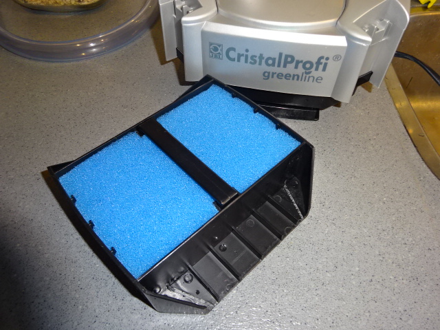 Met mijn 401 als stofzuiger merkte ik dat bij de groffilter vakken (bovenste bak,buitenste 2 vakken) er nog wel zand in de hoeken blijft zitten die ik voorzichtig in de gootsteen, boven de filterpot, moest schoonspoelen en er bleeft nog wat slierten mest zitten. Meteen maar de zaag in die bak gezet en de 4 verstevigingsribben uitgebroken dus nu moet het zand en troep meteen onderin komen.