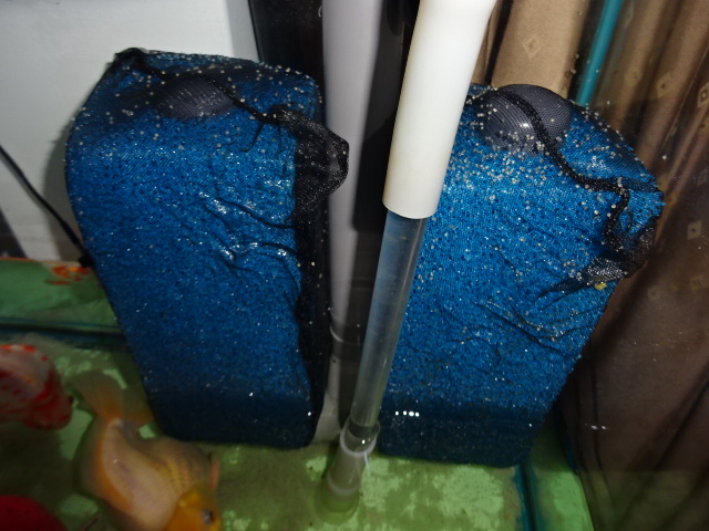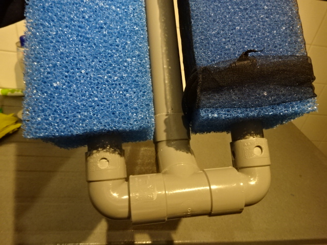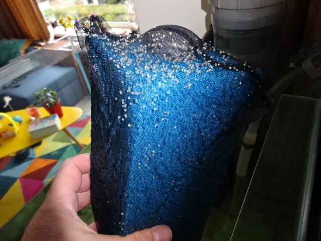 Enigst onverwacht minpuntje is dat de schuimblokken met pvc lichter zijn als water dus moet ik er nog een strip lood oid in zetten om te verzwaren. Voorlopig heb ik er even een stromingspompje boven gezet om te kijken of ik iets meer troep onder de filterblokken kan krijgen zodat die door de gravelvac gevangen kan worden.
