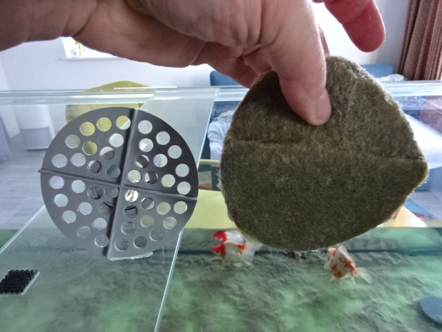 De fijnfilter mat van Biohome bleek te krimpen en nu vervangen voor een dikke laag watten. Is lokaal makkelijk te krijgen en goedkoper zo en blijft beter afsluiten. Hetin vorm knippen is ook lastig om precies goed te krijgen.