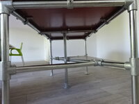 Zondag 18mm betonplex laten zagen en gisteren potgaten geboord voor inslagmoeren. NU zijn de montageflenzen op het blad gebout en kan ik de buizen en koppelingen goed uitlijnen. Wel jammer dat de maatvoering zeer los is en onnauwkeurig dus moeten er vulstrippen tussen buis en blad komen om de vlakheid te garanderen en de druk te verdelen.