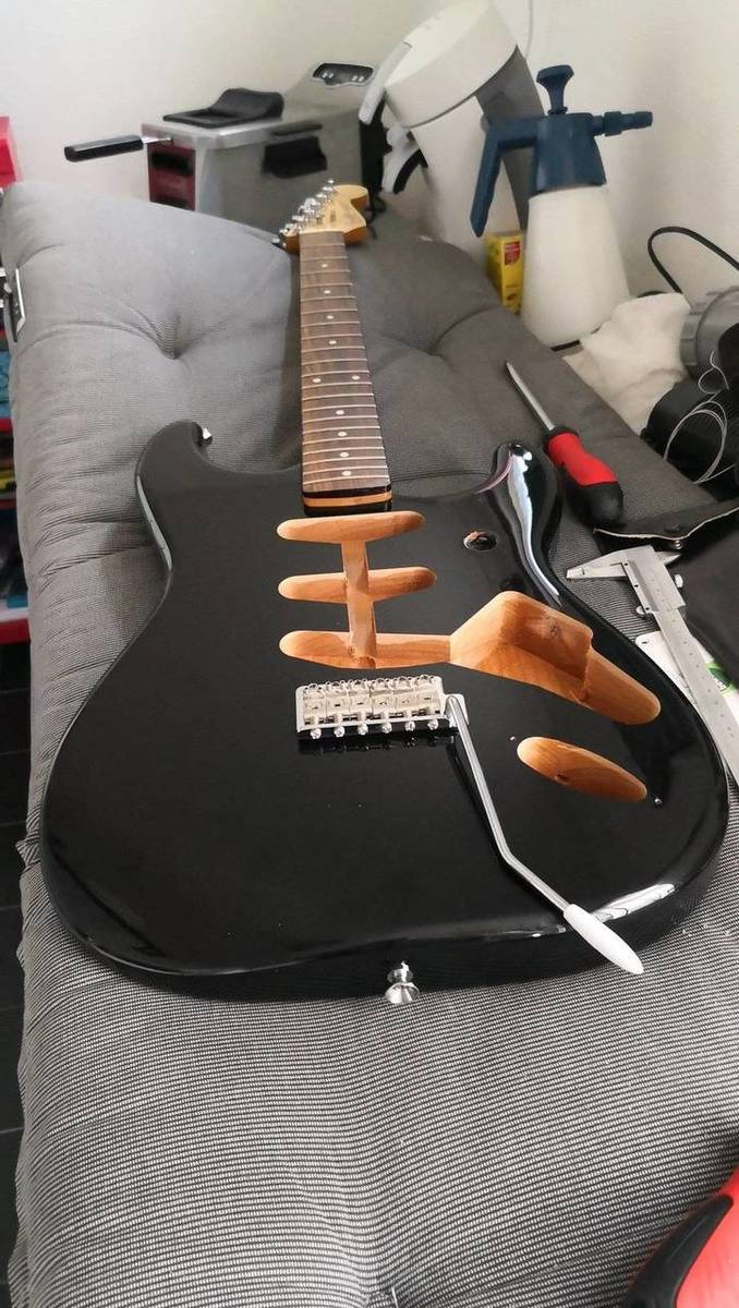 Wat je uitgespookt hebt met die gitaar, daar snap ik helemaal niets van, maar je hebt het erg mooi afgewerkt.Hij zit in elkaar, de gitaar. Morgen nog even precies afstellen en..... spelen maar!