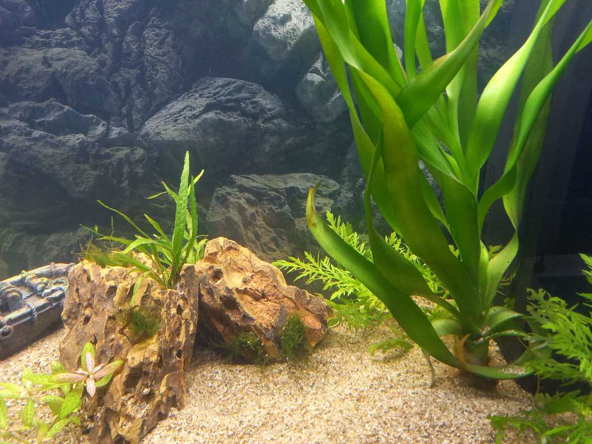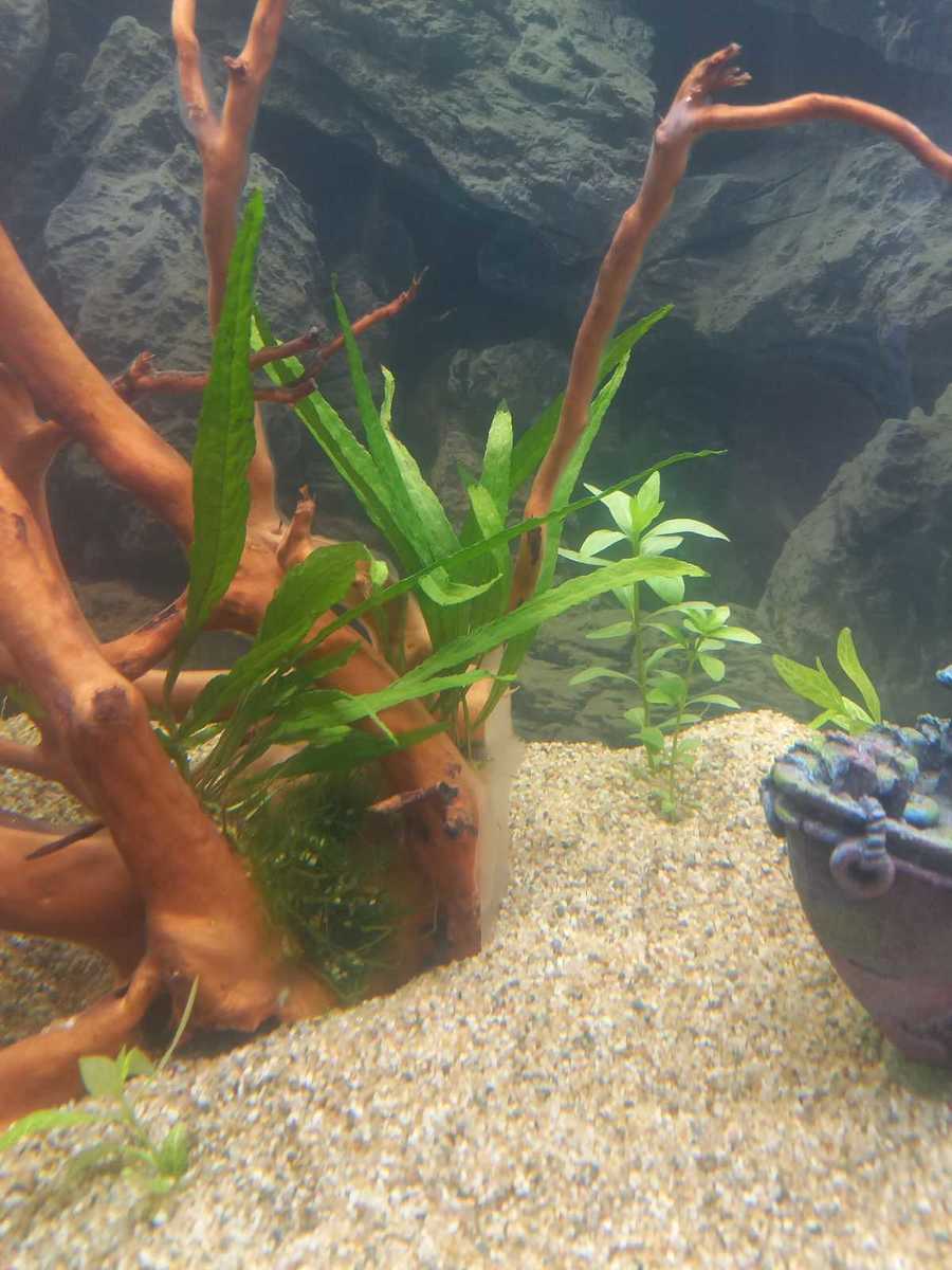 Zonen willen voor de filter nog een plantje plaatsen; de vallisnera willen ze zo laten omdat ze gelezen hebben dat Goerami's