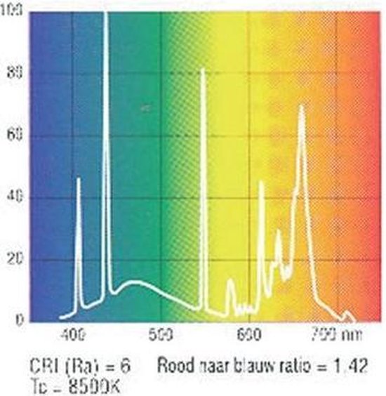 Grolux is juist speciaal ontworpen voor plantengroei. Grolux ---> grow lux. In onderstaand spectrum zie je veel blauw en rood. Kleuren die belangrijk zijn voor plantengroei. De eenheid lm heeft hier weinig zin. Daarin worden juist deze kleuren weinig meegewogen.