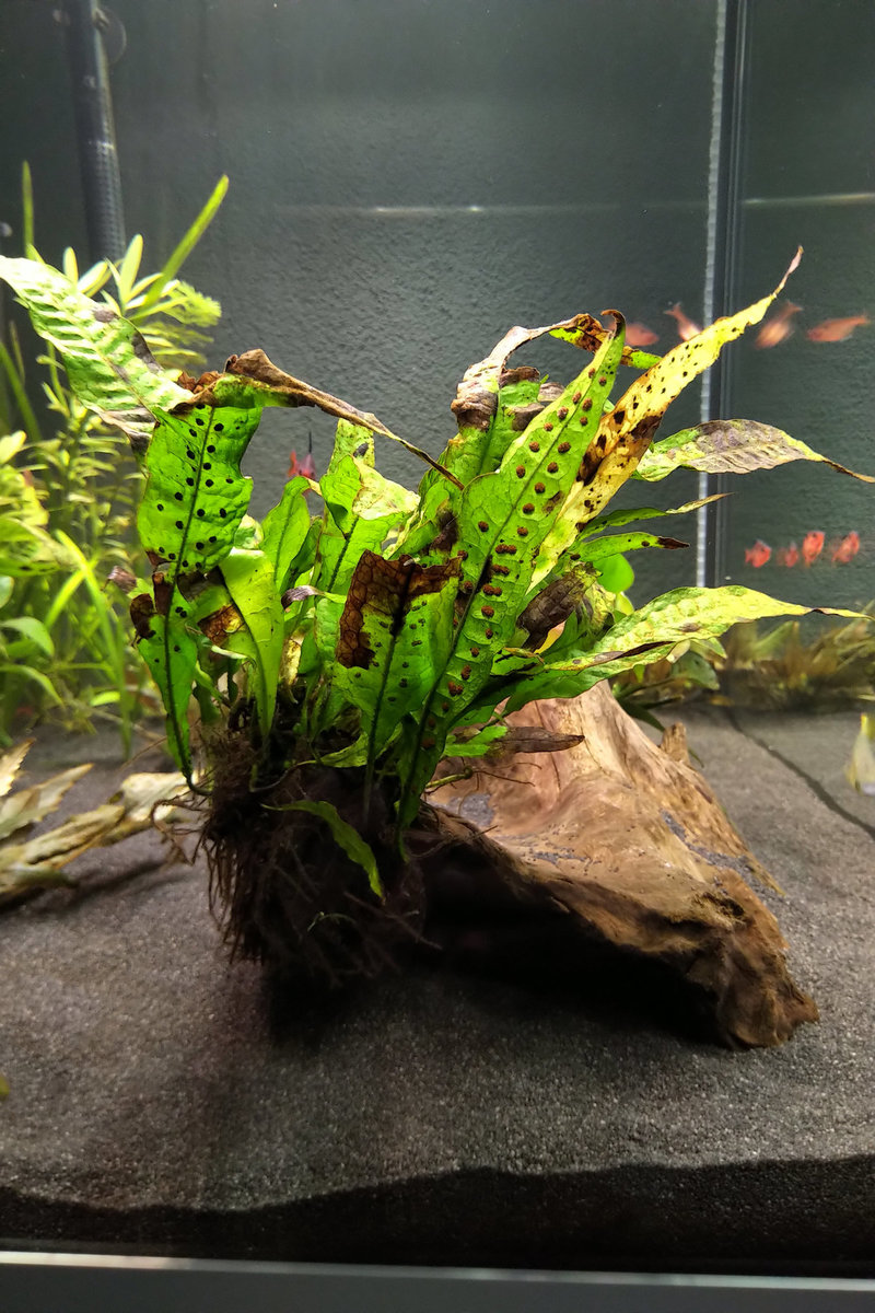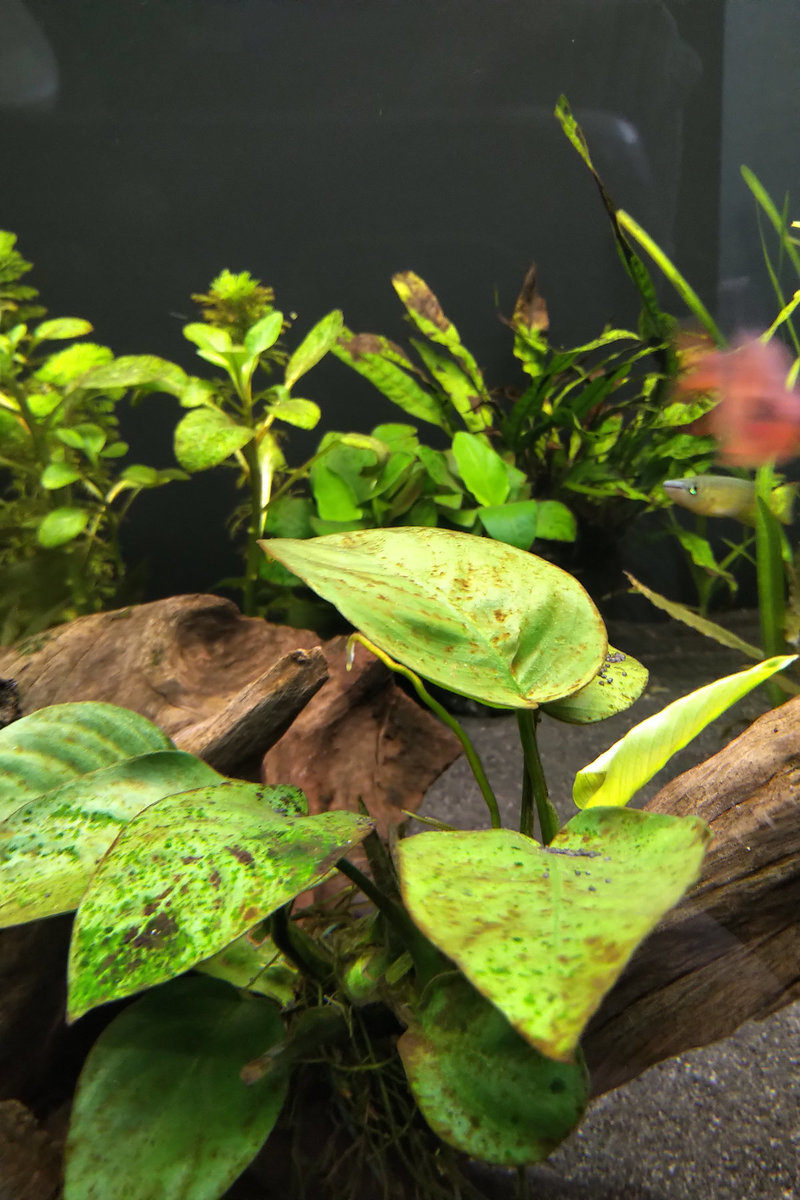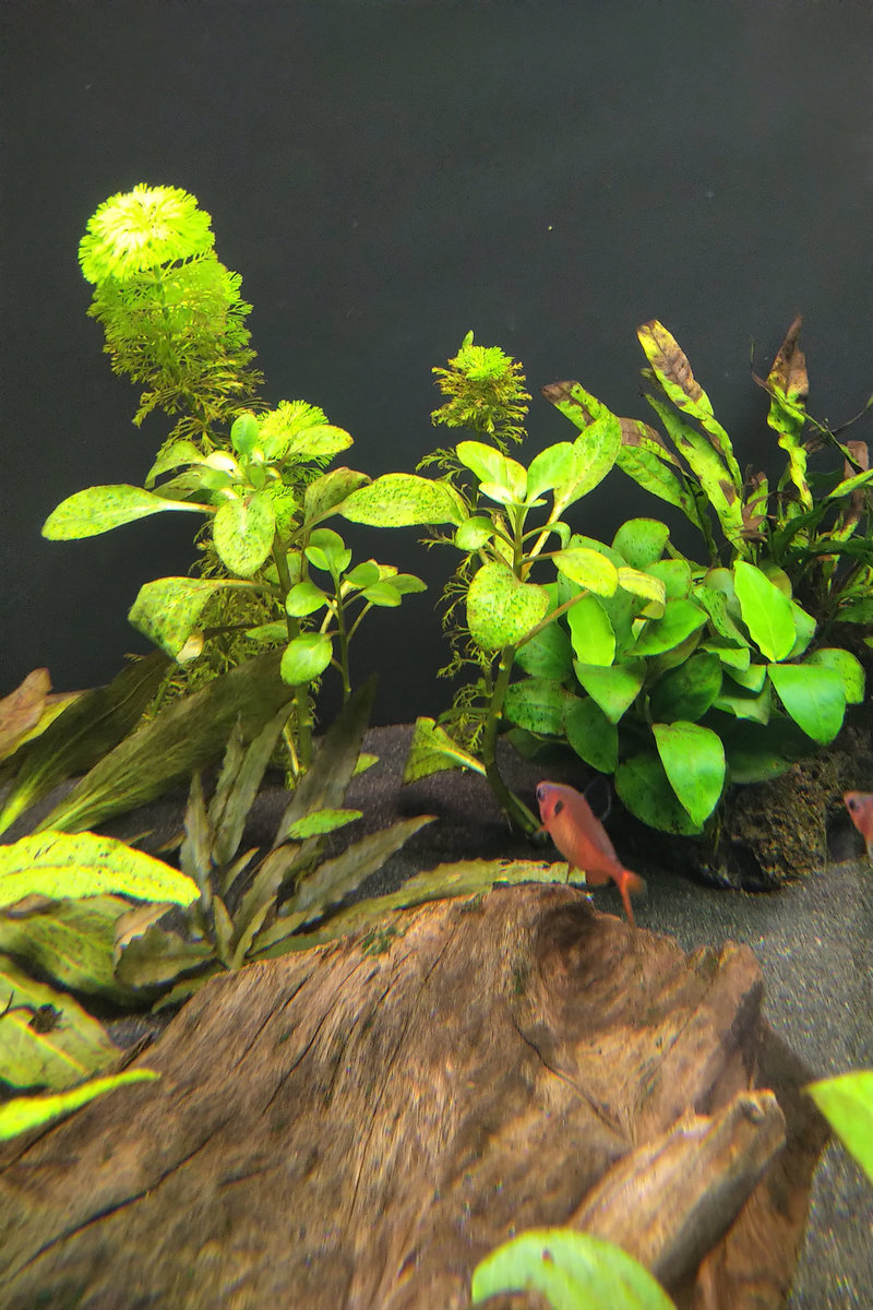 Omdat ik bij een waterverversing erachter kwam dat er veel vuil achter het hout bleef liggen, heb ik deze voor het gemak middenin gezet zodat de doorstroming goed blijft lopen en er geen vuil kan ophopen. Dit staat nu al een week of 4 zo en de javaren was ervoor al zo bruin en de anubias had ook voor verplaatsing al zijn punt alg.