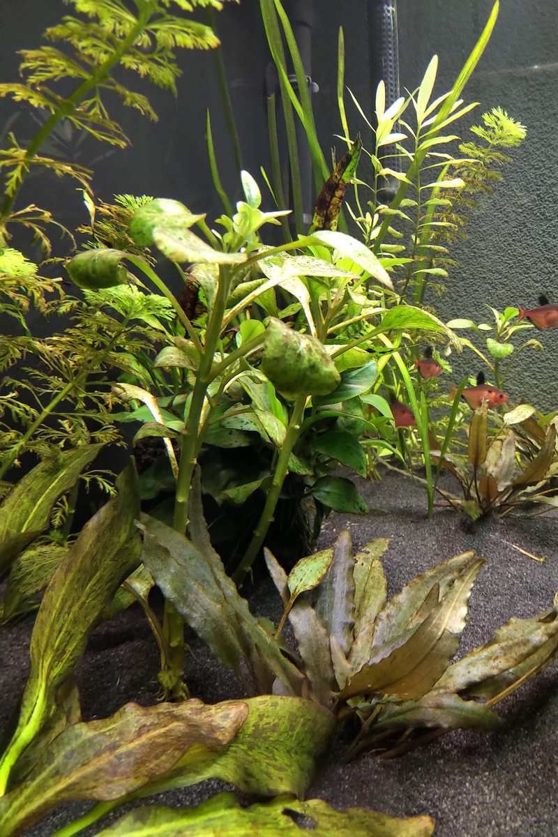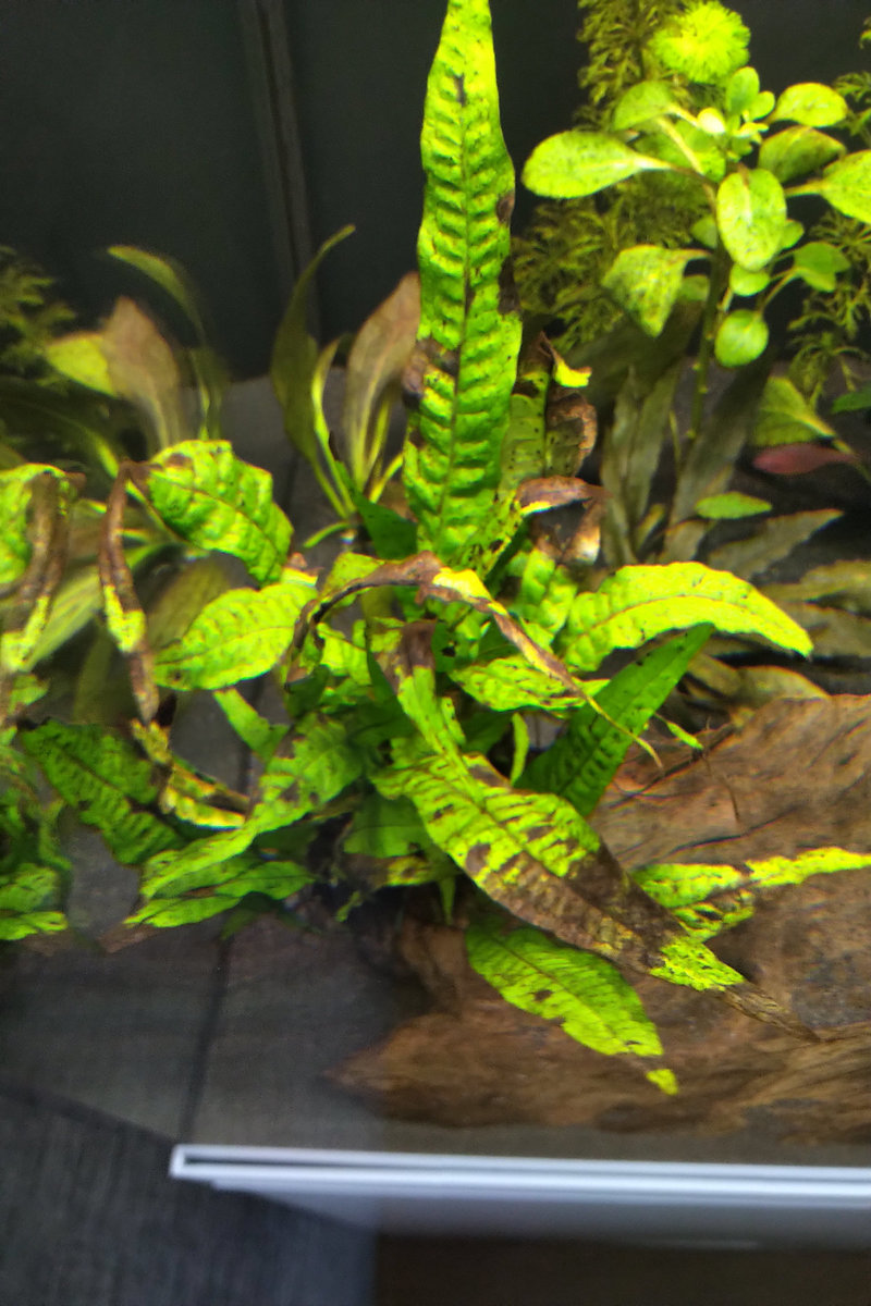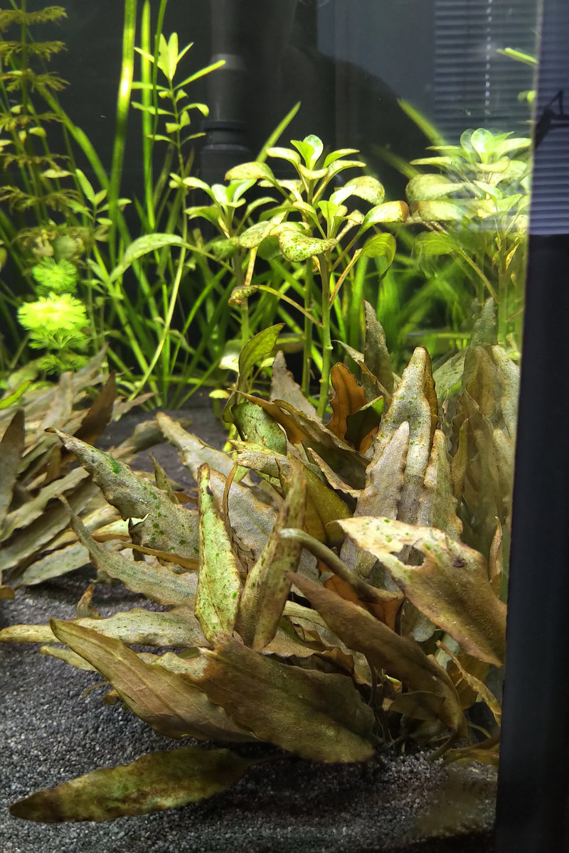 De Javavaren werd bruin en niet een enkel blad, maar allemaal. De puntalg zit vooral op de Anubias en de Lobelia Cardialis en deze laatste word kaal aan de onderkant. En de Echinodorus Ozelot wil al helemaal niet groeien. De Cryptocoryne Wendtii Bruin kreeg wat gaatjes in de bladeren.