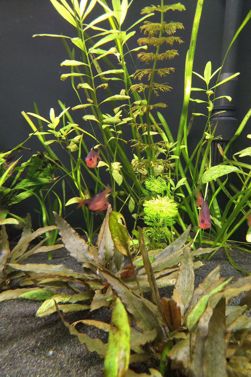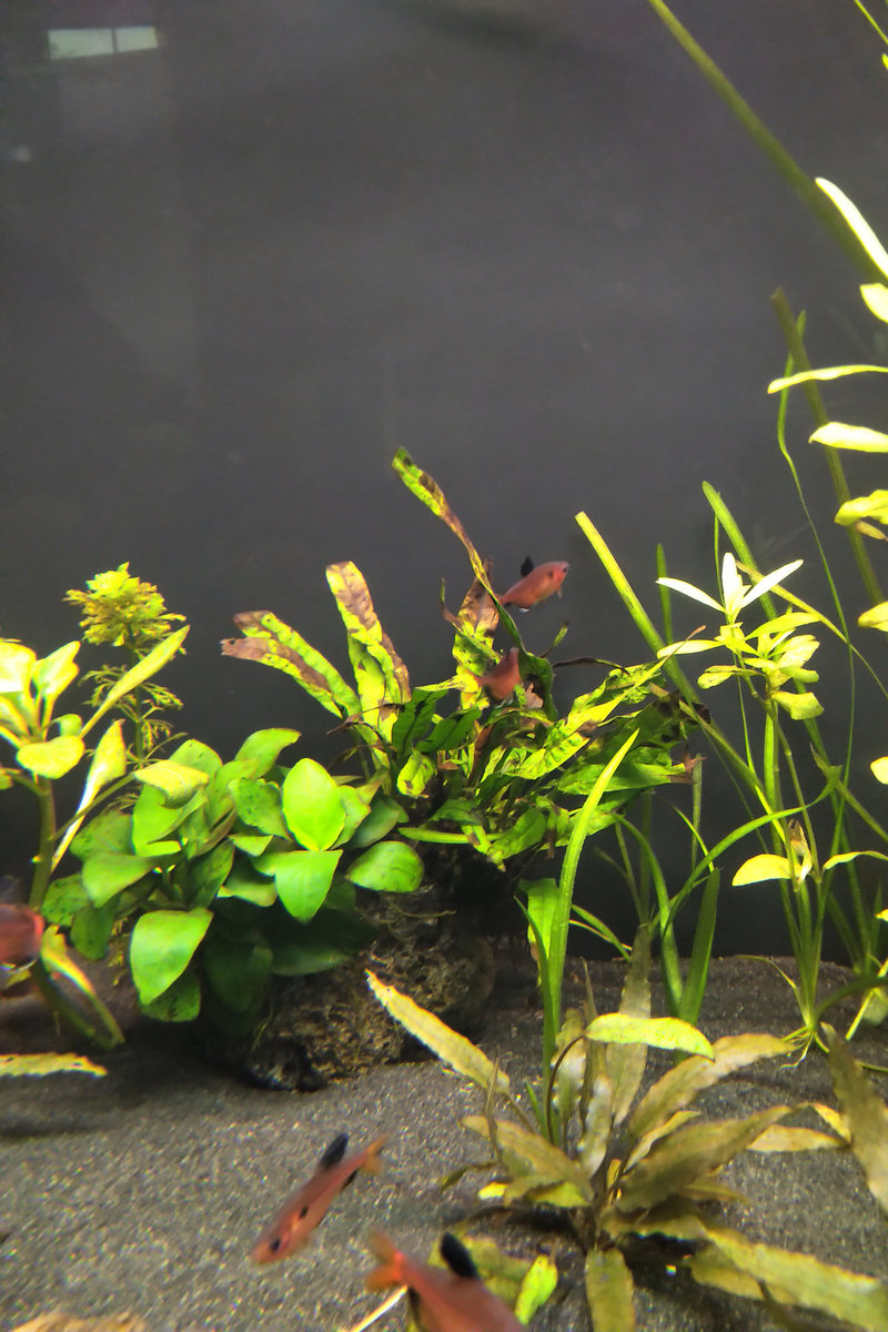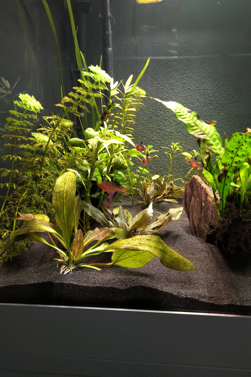 De opstart ging goed, behalve wat bacteriebloei, wat schimmel op het zand, nitrietpiek gehad, en was de bak na 4 weken klaar voor de vissen. Ik heb er toen eerst 15 Rode Minors ingedaan en twee weken later 4 Killi vissen. Planten deden het ook nog goed, mooi helder water ook en toen sloeg de bruinalg toe. Elke week de bruinalg weg gehaald, dit goed bijgehouden, maar de planten kregen een flinke opdonder. Vanuit mijn andere aquarium een drietal Oto’s erin gedaan die mij enorm geholpen hebben met schoonmaken van de bruinalg. Toen het wat beter leek te gaan, de Oto’s weer teruggezet in hun eigen bak.