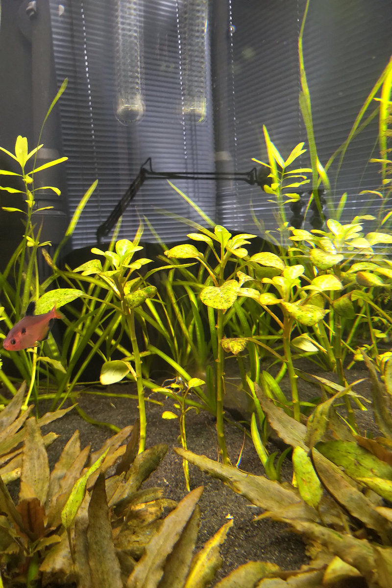Zoals ik zei, de foto oogt geel, maar de planten zijn echt heel mooi groen. Wat een verschil! Zo blij mee. De bruinalg is ook zowat verdwenen, ik zie het nauwelijk meer op de ruiten, alleen op de onderste delen van de planten is nog wat aanwezig. Dus het gaat echt de goede kant op.