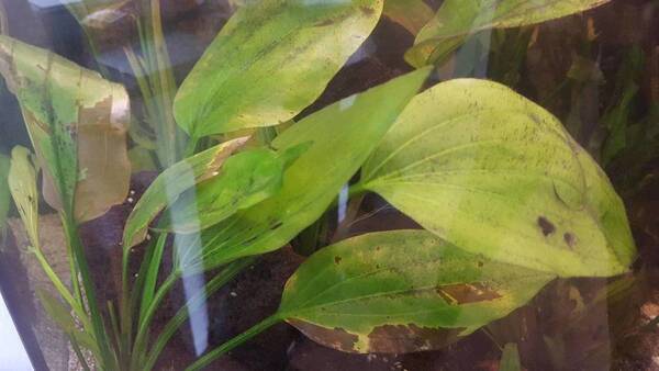 Ik heb een aantal weken terug een groot aantal nieuwe planten in het aquarium gezet. Nu wordt bij een groot deel de bladeren slecht. Er komen gaten in en ze worden uiteindelijk bruin doorzichtig. Waterwaardes zijn goed, ze staan goed in een fijn kiezel bodem en krijgen co2 vloeibaar toegevoegd. Daarnaast zit er ook nog voeding in de bodem. Het vindt dus voornamelijk bij de groot/lang bladige planten plaats -> echinodorus. Komt dit omdat ze zich moeten 'settelen'?
