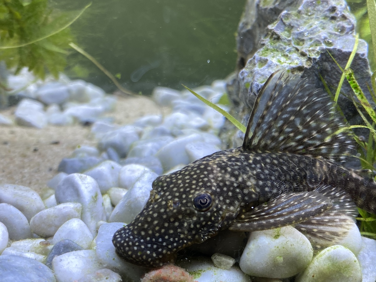 De Ancistrus laat zich ook even zien, deze is ondertussen een jaar of 9 a 10. Ik ben benieuwd hoe oud zij zal worden. Ze is in ieder geval blij met wat hout in het aquarium.