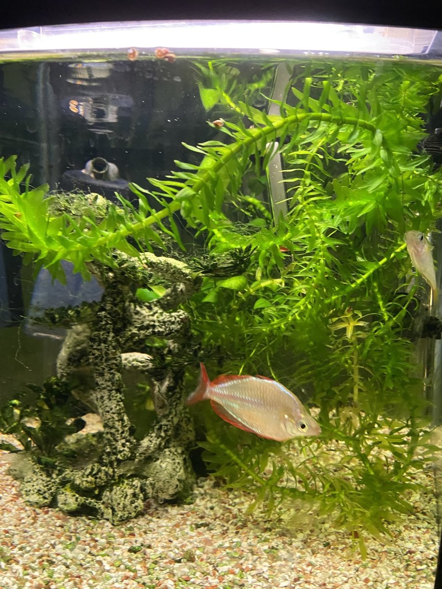 Verder heb ik wat Amano garnalen toegevoegd... en niet meer teruggezien dus ik hoop dat ze nog leven. Toen ik in de dierenwinkel was zag ik 4 Corydoras Habrosus die ik ook maar mee heb genomen. Ik wil het schooltje uitbreiden naar 12 in de toekomst. Ze zijn nu zo klein dat ze amper te zien zijn in het aquarium. En de regenboogvissen vinden ze erg interessant. Ik houd het maar even scherp in de gaten nog een aantal dagen. Het oude aquarium draait nu nog dus ik zou ze altijd nog even apart kunnen zetten totdat ze wat groter zijn. Ook al vermoed ik dat ik ze niet meer zomaar kan vangen.