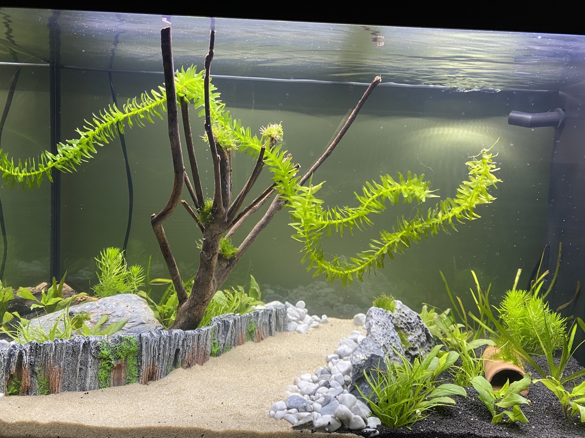 Met de vissen zelf gaat het geweldig, ze groeien goed en zijn heel erg actief. Het aquarium heb ik recent helemaal omgegooid, ik had last van wat blauwalg, een stuk hardscape blokkeerde de stroming, en mijn zandbodem was helemaal dichtgeslibt. Ik heb het zand verwijderd en nu alleen nog maar fijn grind, en een wavemaker toegevoegd voor wat extra stroming. Ik heb ook een groot gedeelte van mijn planten weggegooid en alleen de mooie stukken gehouden. De blauwalg is nu weg en de enige alg die overblijft is wat bruinalg op de ramen en een klein beetje groene draadalg in het javamos. Met beiden kan ik wel leven.