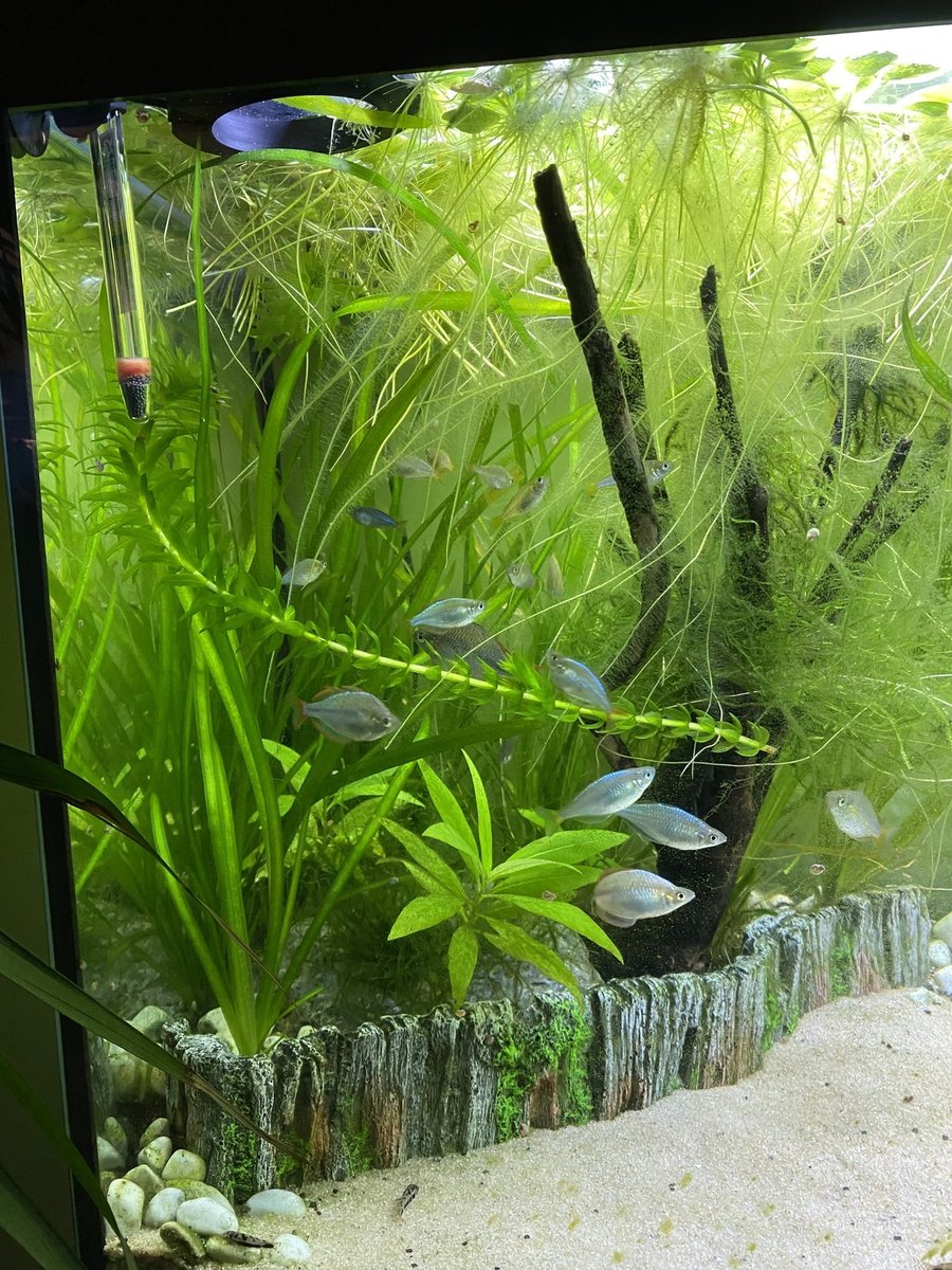 Ondertussen zijn de Corydoras Habrosus helemaal bijgetrokken qua kleur. Ik denk dat ze echt vooral geschrokken waren van de verhuizing, ze waren helemaal bleek weggetrokken en volgens mij zaten ze in de winkel op koud water. De zak was in ieder geval helemaal koud. Ze hebben het allemaal overleefd en scholen leuk samen. Ze lijken ook al wat gegroeid.