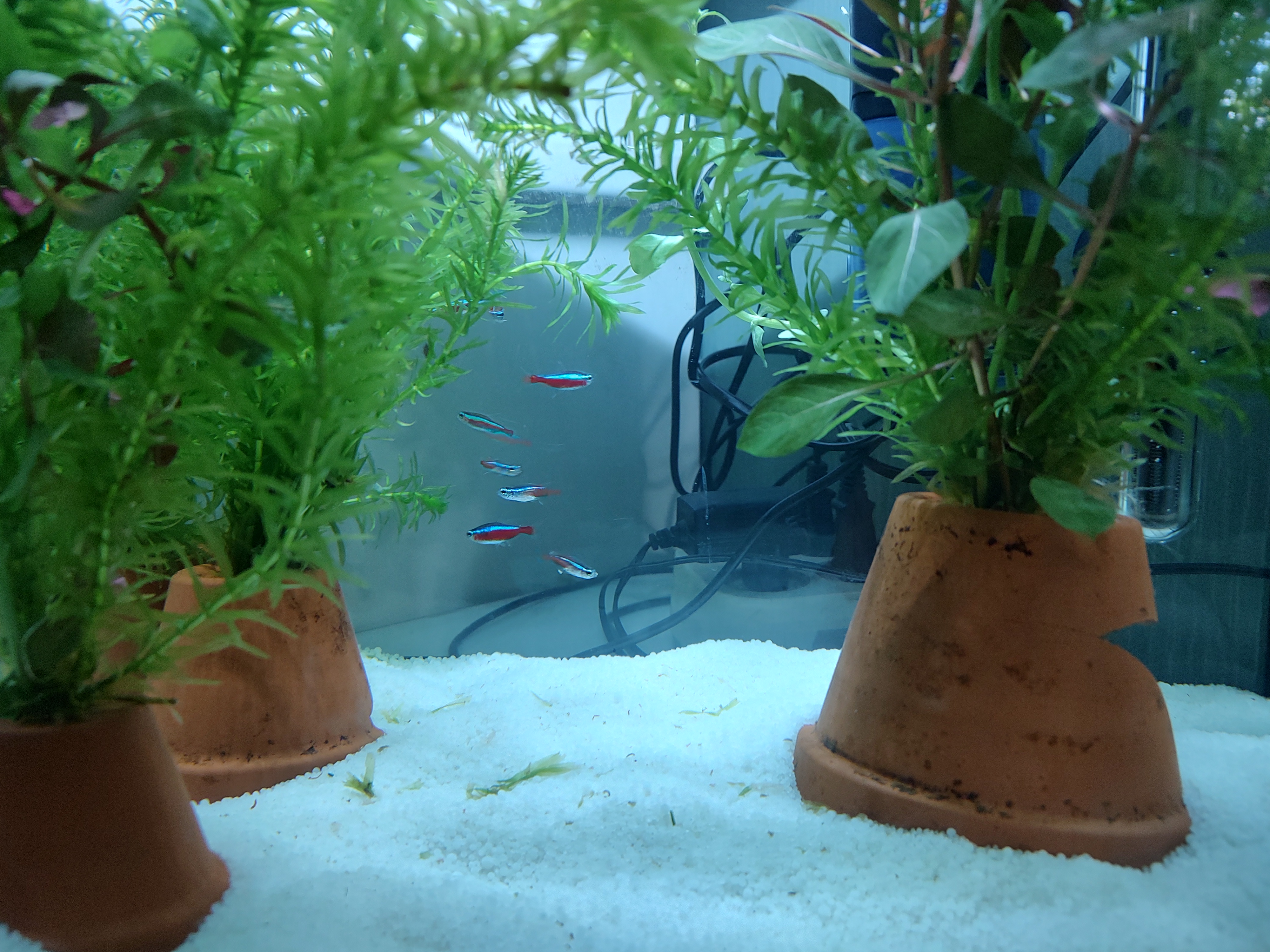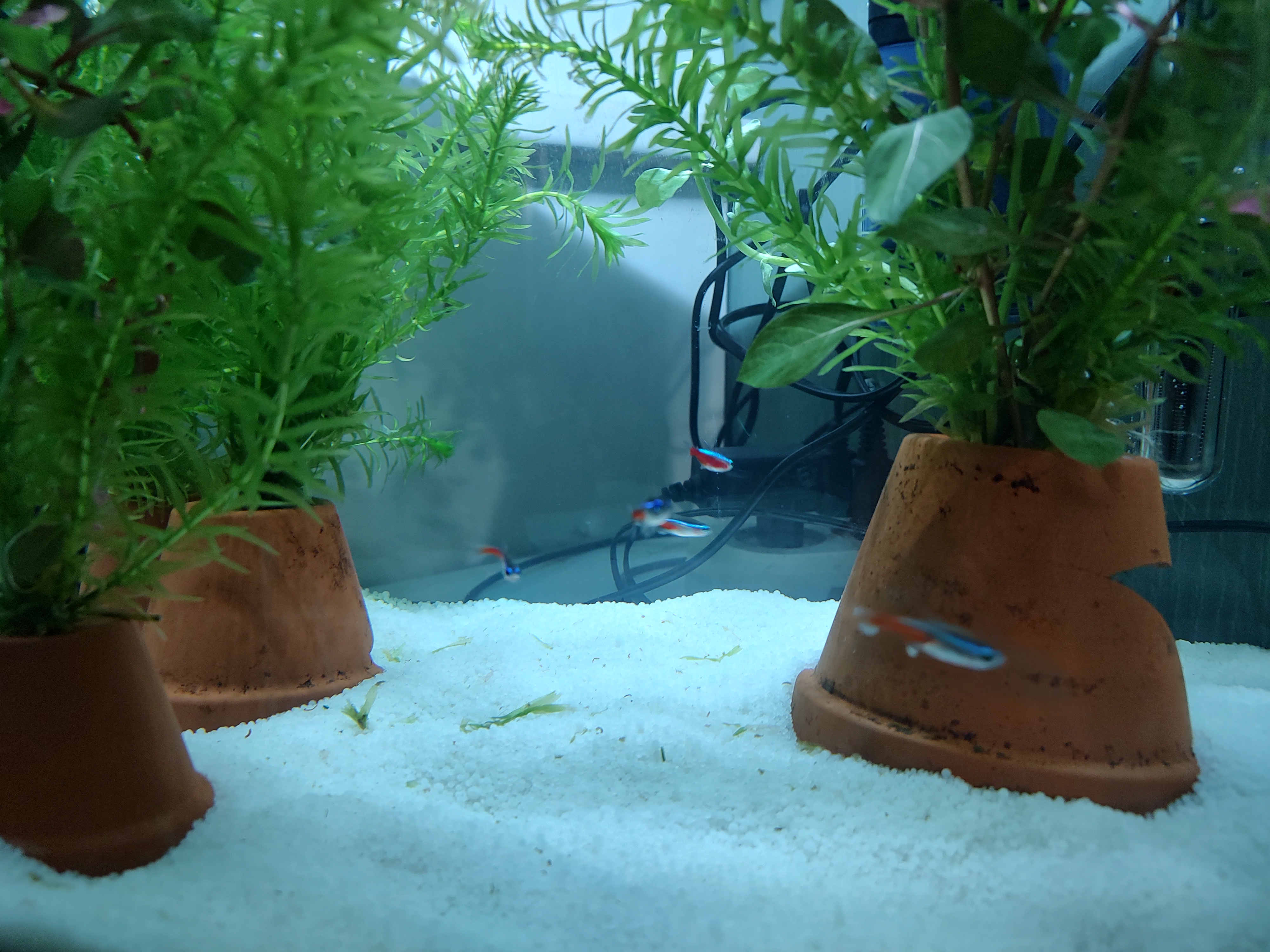 Drie dagen geleden is de thermoregulator van het neon tetra aquarium kapot gegaan. Meteen een nieuwe gehaald en aangezien de planten aan vervanging toe waren, deze ook deels vervangen.