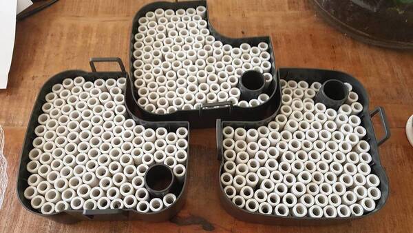 de kinderarbeid is klaar😎 Past wel enorm veel in op deze manier... "Gestort" ging er net geen liter in een bakje en nu zou er denk ik wel 5 liter in 3 bakjes gaan. In mijn ander filter zit het niet gestapeld dus ik ga daar wel 1 of 2 bakjes van in de nieuwe filter doen. bij elkaar zit er nu zo'n 8 liter biologische filtering op mijn 300 liter bak. Dus zal in iedergeval meer dan voldoende zijn denk ik.