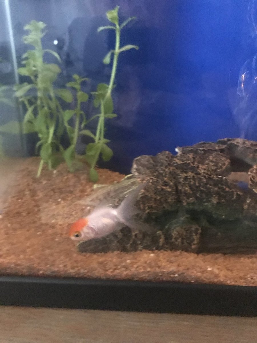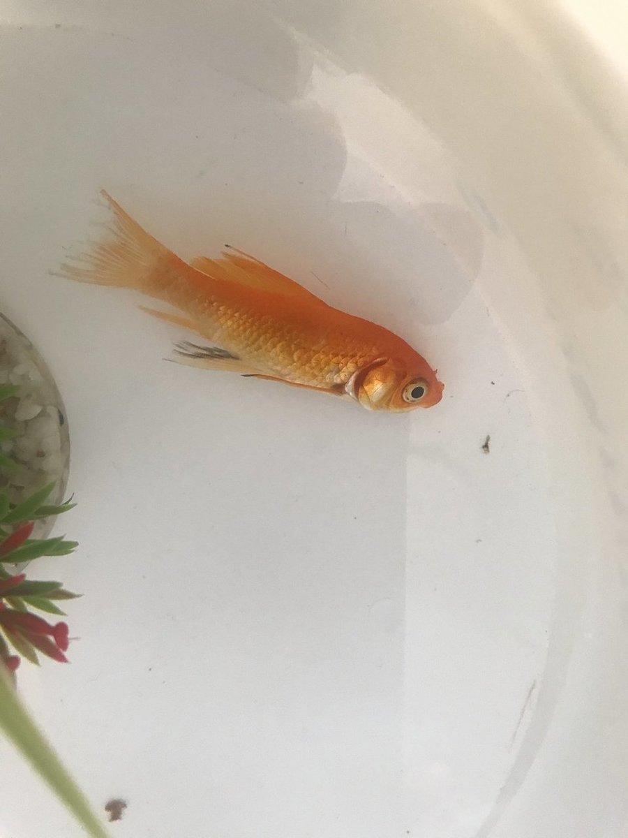 Het is de eerste keer dat ik hier iets in post. Ik heb namelijk met kerst een goudvis gekregen en hem (heel onwetend dat ik was) vergezeld met 2 anderen. Zoals velen hier ben ik serieus belazerd geweest door de dierenwinkel door aan te geven dat een aquarium van 20L zeker voldoende was. Ondertussen heb ik een grote buitenfilter gekocht waar ik nog steeds op aan het wachten ben. Dit omdat ik merkte dat mijn filter het niet kon trekken (duh, zullen jullie wel zeggen..?). Mijn vissen hadden last van vinrot. Wat heel logisch is aangezien ze zo klein zitten met een belachelijk slechte filter. Ik heb ze allemaal antibiotica gegeven en dat verliep vlot. Iedereen genas en de ziekste werd terug levendig! Maar plots begon de meest levendige en in mijn ogen de sterkste, veel op de bodem te liggen en echt aanzienlijk te vermageren. Ook merkte ik dat zijn staartvin opnieuw begon uit te rafelen en had dan opnieuw de AB toegediend omdat ik op fora las dat je het 6 dagen beter doet dan 3(zoalsop voorschrift). Dit heeft niets geholpen en nu light hij op de bodem, eet niet meer en laat zich mee sleuren door de stroming. Ik vind dit echt verschrikkelijk erg en wil proberen hem zo goed mogelijk nog te kunnen behandelen. Ik hoop dat jullie me nog wat hoop voor dit visje kunnen geven, want ik wil hetecht nog niet opgeven! Op de foto zien jullie het visje. Ik heb hem even apart gezet voor de foto en omdat ik Dacht dat het zo beter was aangezien hij anders door de stroming tussen het plantje komt te liggen..