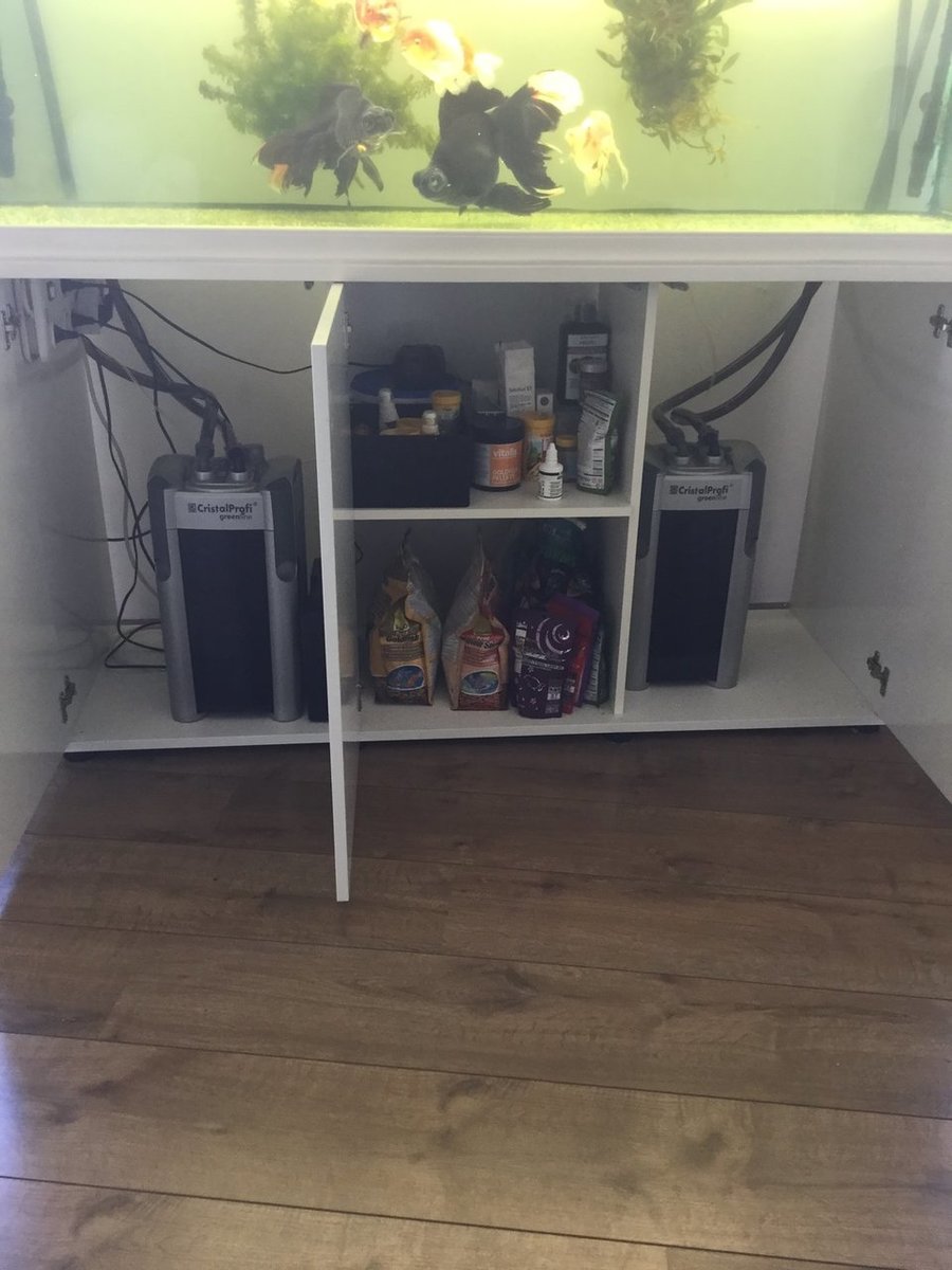 Veel mensen kopen een aquarium met kastjes eronder. In het aquarium zit meestal een ingebouwd filter, maar dit is helaas ook niet genoeg als je Sluierstaarten wilt houden. Goudvissen laten we vanaf nu even buiten beschouwing, die vinden het doorgaans binnen te warm en komen in een vijver buiten beter tot hun recht. Sluierstaarten zijn extra gevoelig voor slechte waterwaarden, met name de vissen met extreem lange staarten, " wen" -vorming op de kop, bijzondere " parel" -schubben, " pompons", telescoop- of blaasogen en wat er nog meer aan bijzondere varieteiten rondzwemt. Om toch genoeg biomedia kwijt te kunnen, schaffen we het liefst een of liever twee grote externe filters aan. Eigenlijk werken die hetzelfde als de sumpfilters, maar dan verticaal. Hieronder links een foto van een doorzichtige potfilter, en daarnaast een foto uit het Fotoalbum van @michelle1 , omdat ik het een heel mooi voorbeeld vind van hoe dat eruit ziet. Het is tevens een goed voorbeeld van het formaat dat Sluierstaarten kunnen krijgen als ze goed uitgroeien.