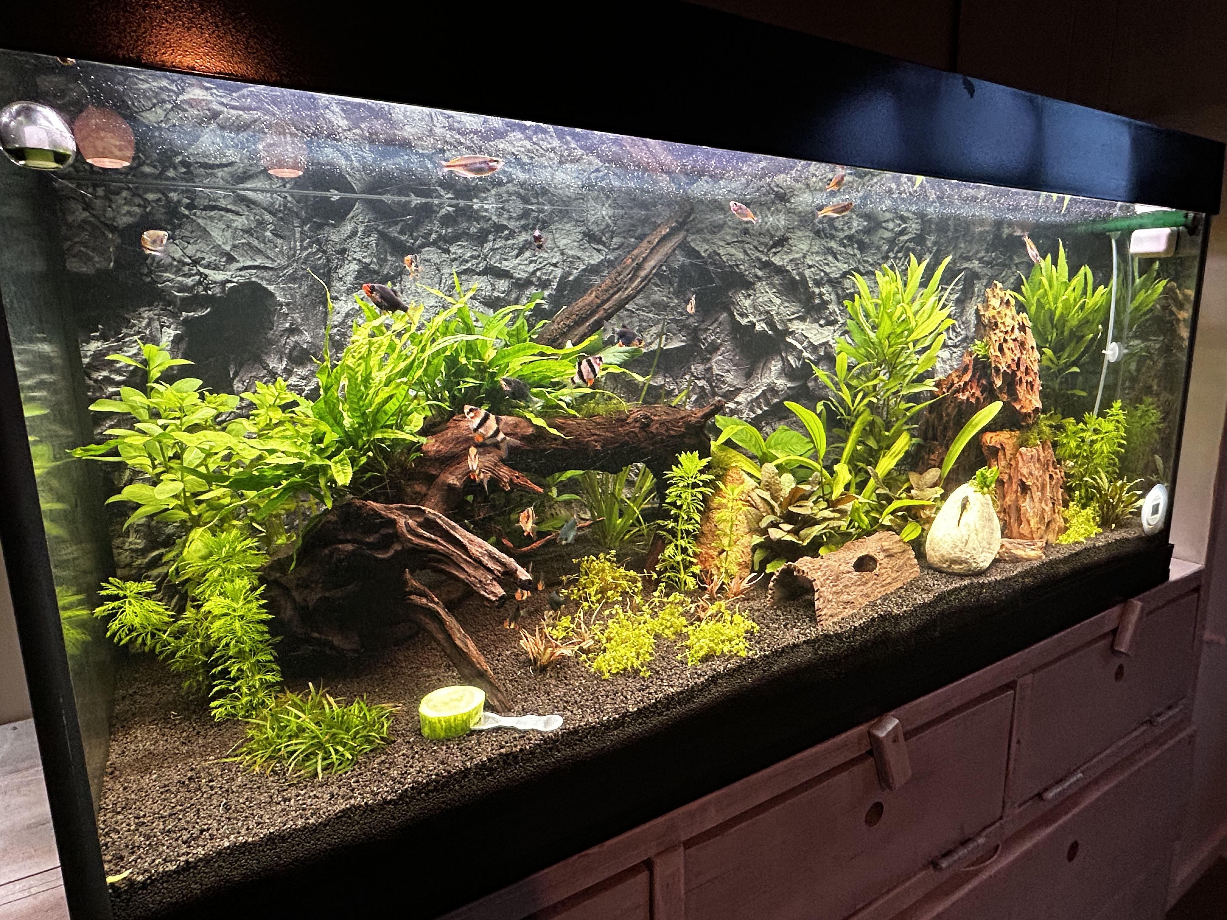 Heb de uitloop van mijn filter even wat meer verplaatst en heb nu behoorlijk meer stroming bovenin de bak. Vissen moeten er even aan wennen geloof ik, ze zijn er wat onrustig van.