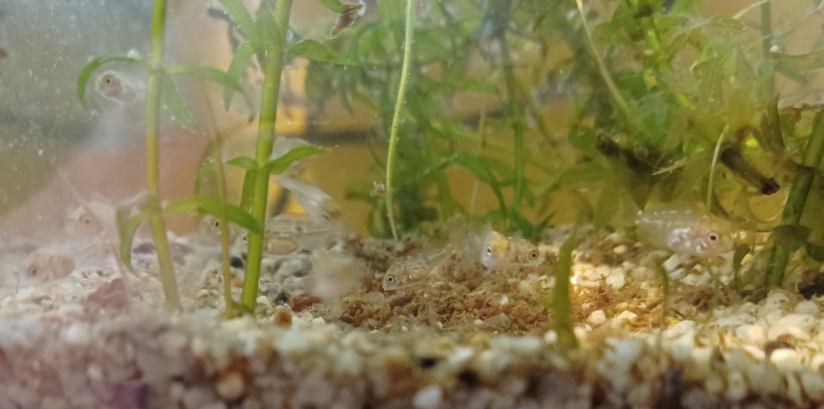 En ook een foto van de pas uitgekomen corydoras aeneus, naar schatting een stuk of 20 à 30.