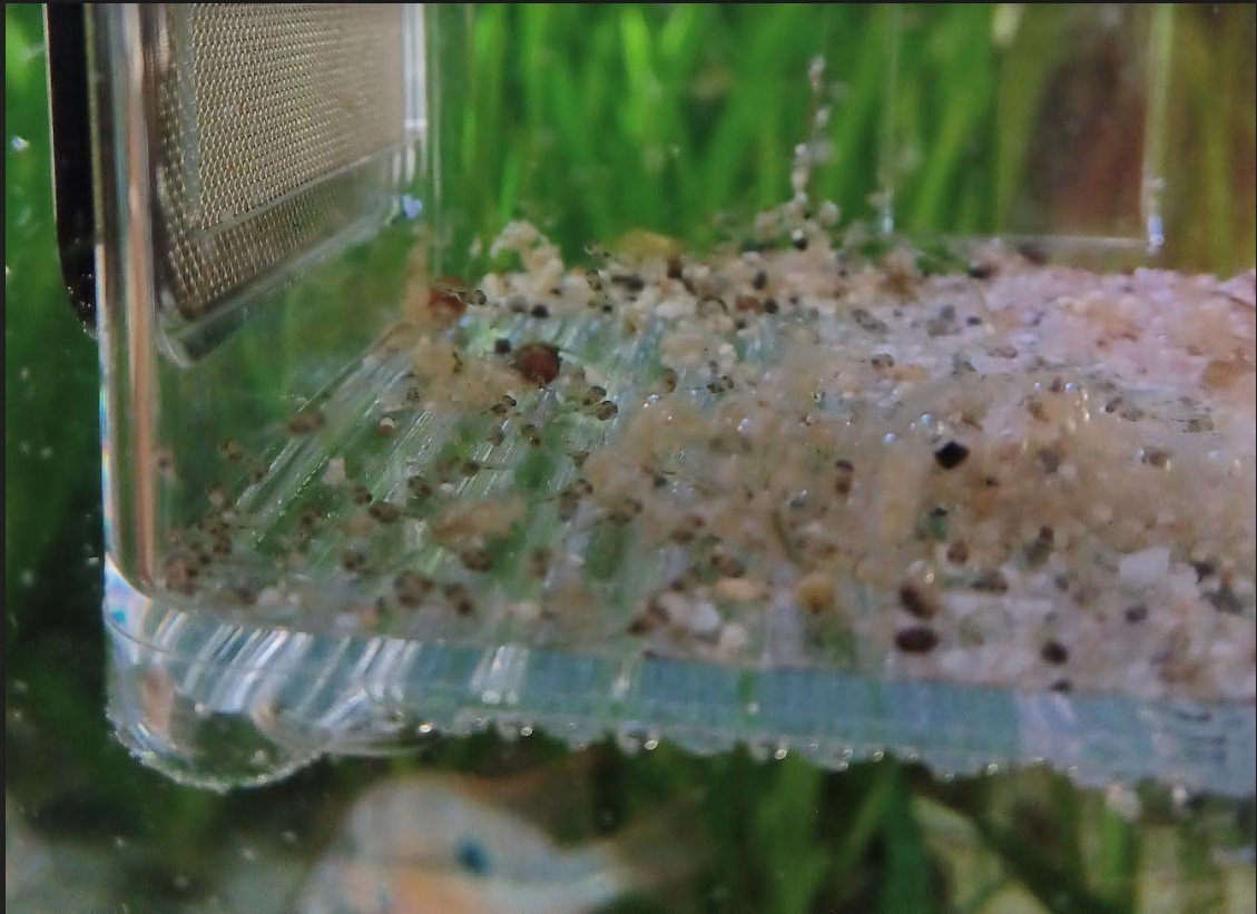 Ze groeien, de grootsten zijn inmiddels een mm of 6, en vandaag het filterpompje maar eens schoongemaakt.