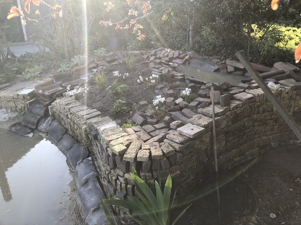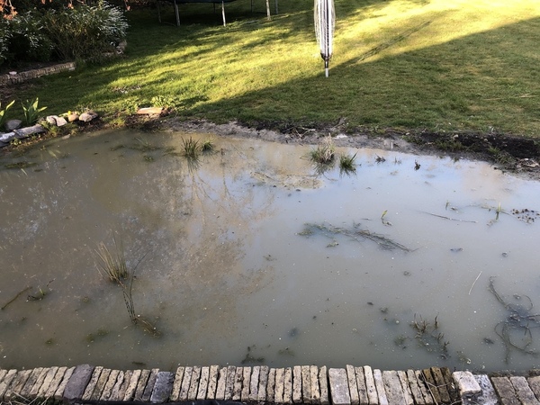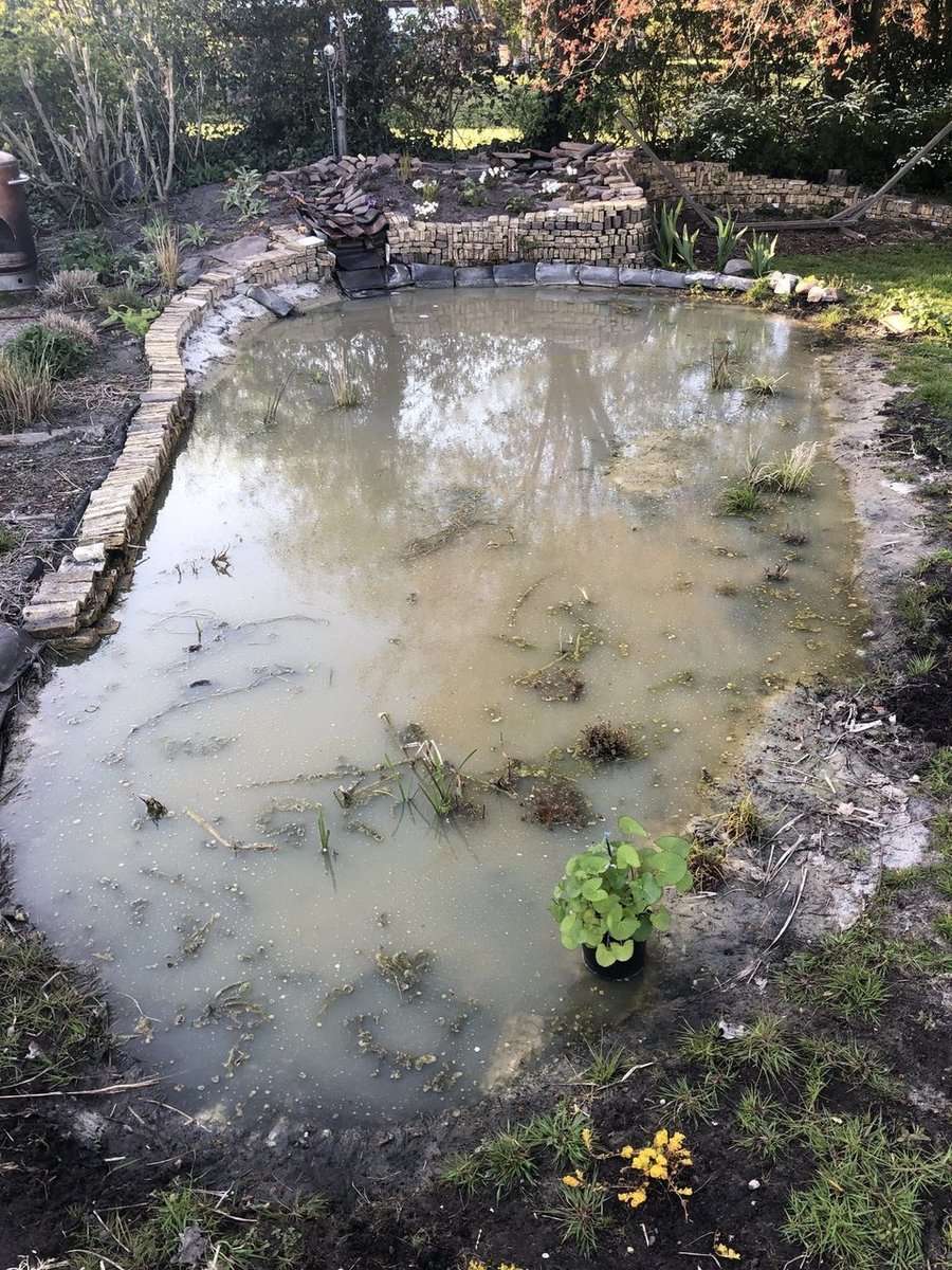 sinds vorig jaar oktober een leemvijver aangelegd in een druppelvorm, zal ong 8 bij 4 zijn. Veel ondiepe stukken voor moeras en in het midden het diepste punt van +- 1.50 m.