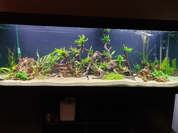 Een klein groepje zwarte tetra`s, wat kleine algeneters en een labeo maar deze gaat er weer uit.