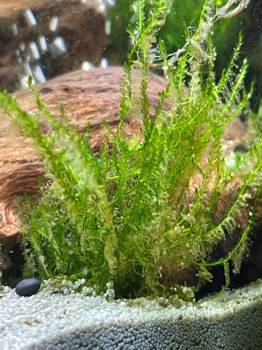 Op foto 2 zie ik geen algen en op foto 1 kan dat geen vuil zijn wat je er met de hand uit kan wapperen? Ik heb het idee dat die rare spul ook een beetje op het grind onder het mos ligt.