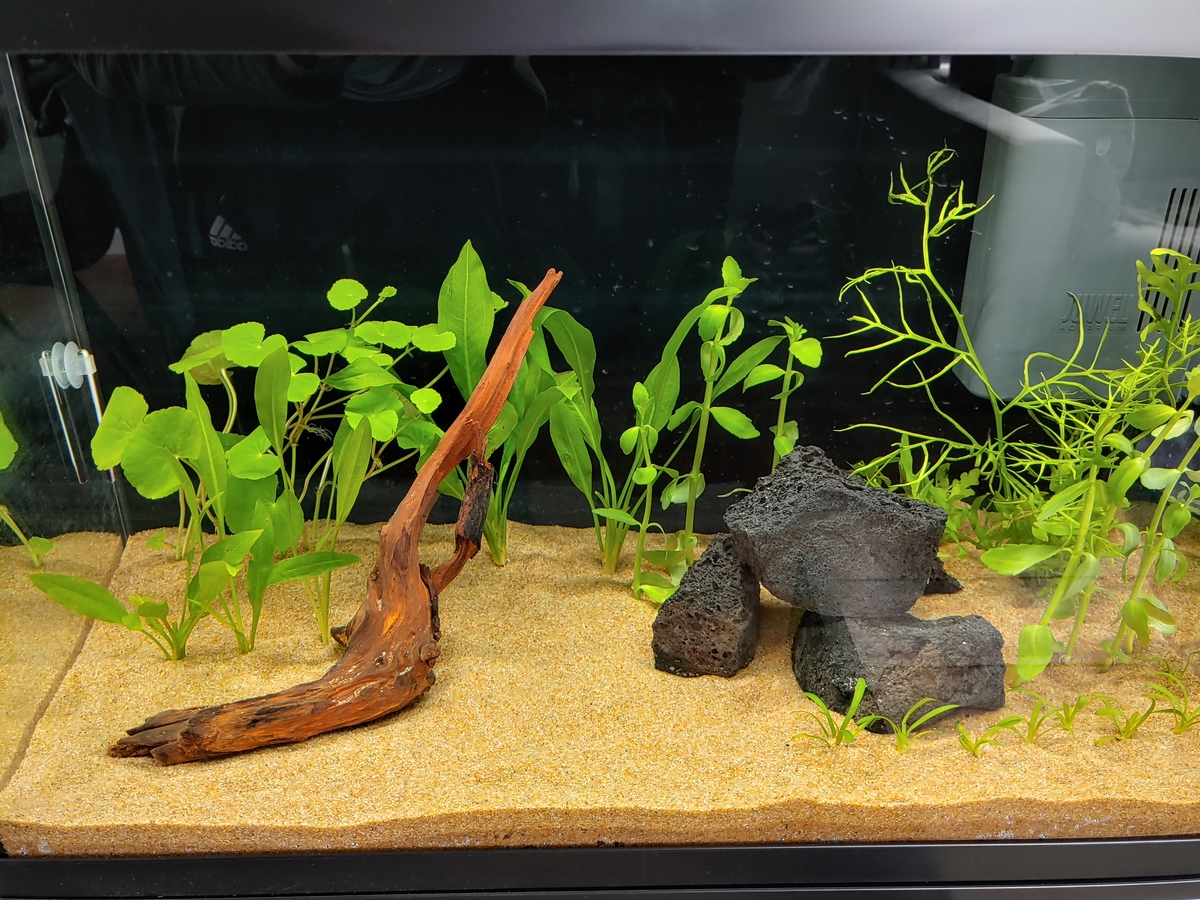 Hardscape: Een paar zwarte lavastenen + een stuk driftwood. De lavastenen heb ik met een hamer en beitel in kleinere stukken geslagen omdat deze nogal groot waren voor mijn aquarium. Daarna heb ik de stenen afgespoeld en een paar dagen in water laten liggen. Het stuk driftwood heb ik ook afgespoeld met warm water en een paar dagen in een emmer water laten liggen om te zorgen dat deze ging zinken.