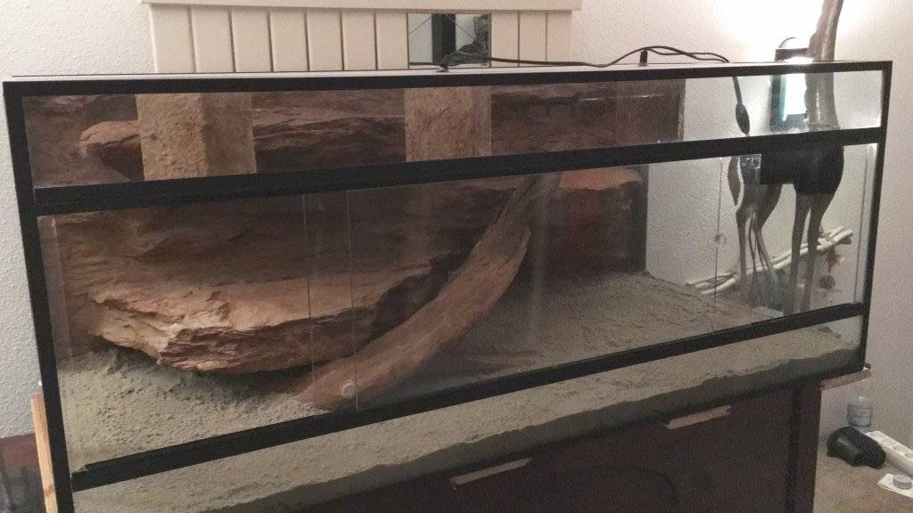 Ik heb gisteren een heel mooi terrarium voor op hem opgehaald! Van 1.20 lang x50 hoog x60 diep! Er zit een super mooie achterwand in met 3 plateaus waar hij op kan liggen (3e zit bovenin achter het linker lampenkapje, maar daar komt geen lamp in hoor!)