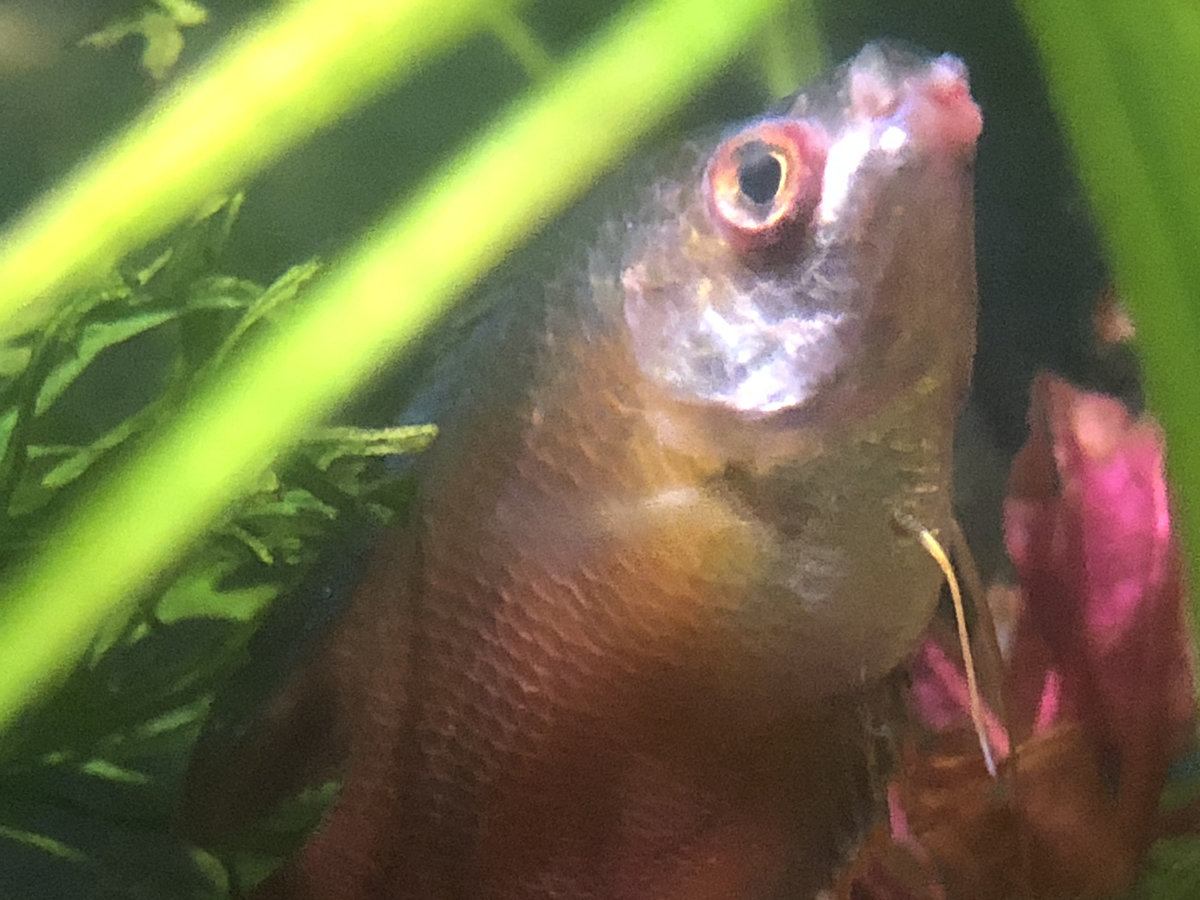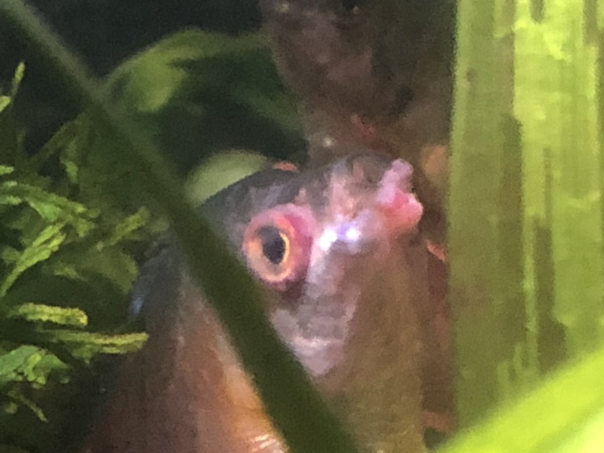 Het viel mij op dat hij met het hoofd geheven drijft en weinig zwemt. De dag er na begon het rechter oog uit te puilen en er hebben nu ook kleine wratten/uitstortingen/bultjes hoe je het maar wilt noemen om de mond ontstaan. Ik weet dat dwerggoerami’s relatief zwakke vissen zijn maar ik heb geen idee wat hier aan de hand is.