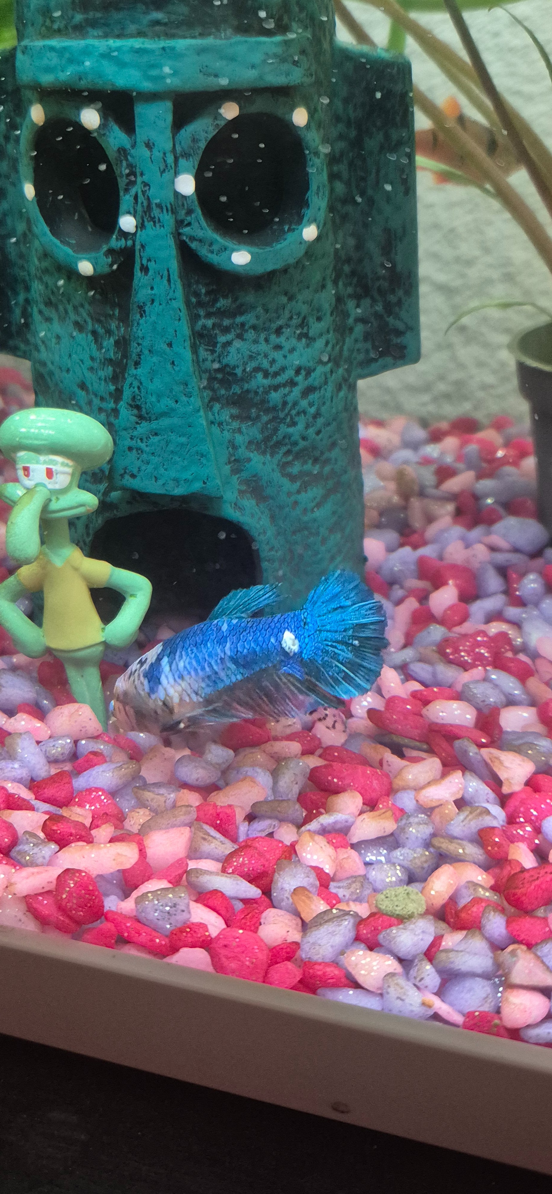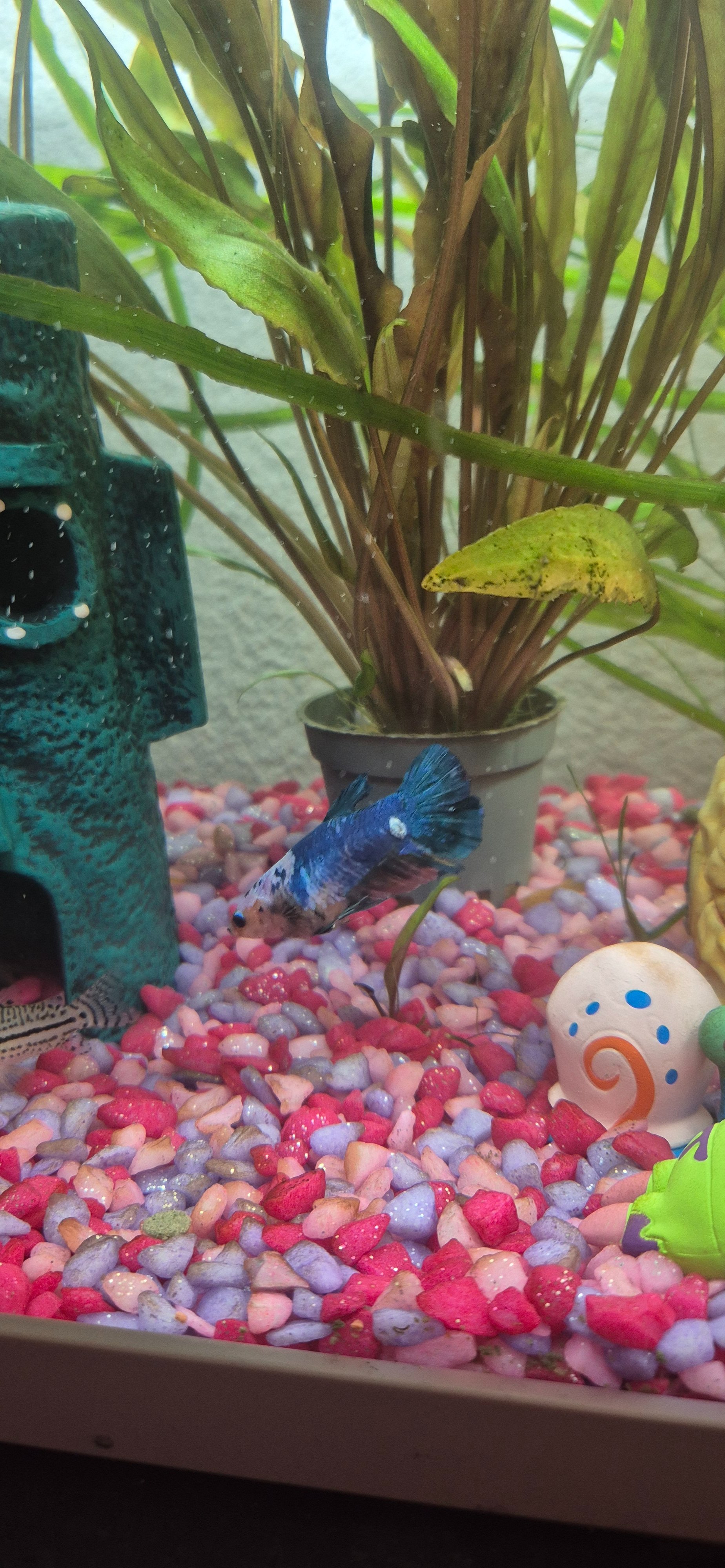 Is dat de enige vis in de bak? Ik zie dus te grof grind en ook planten in een potje dus ik zou als dat kan een fijnere bodem nemen en de planten in de bodem zetten dus uit het potje.