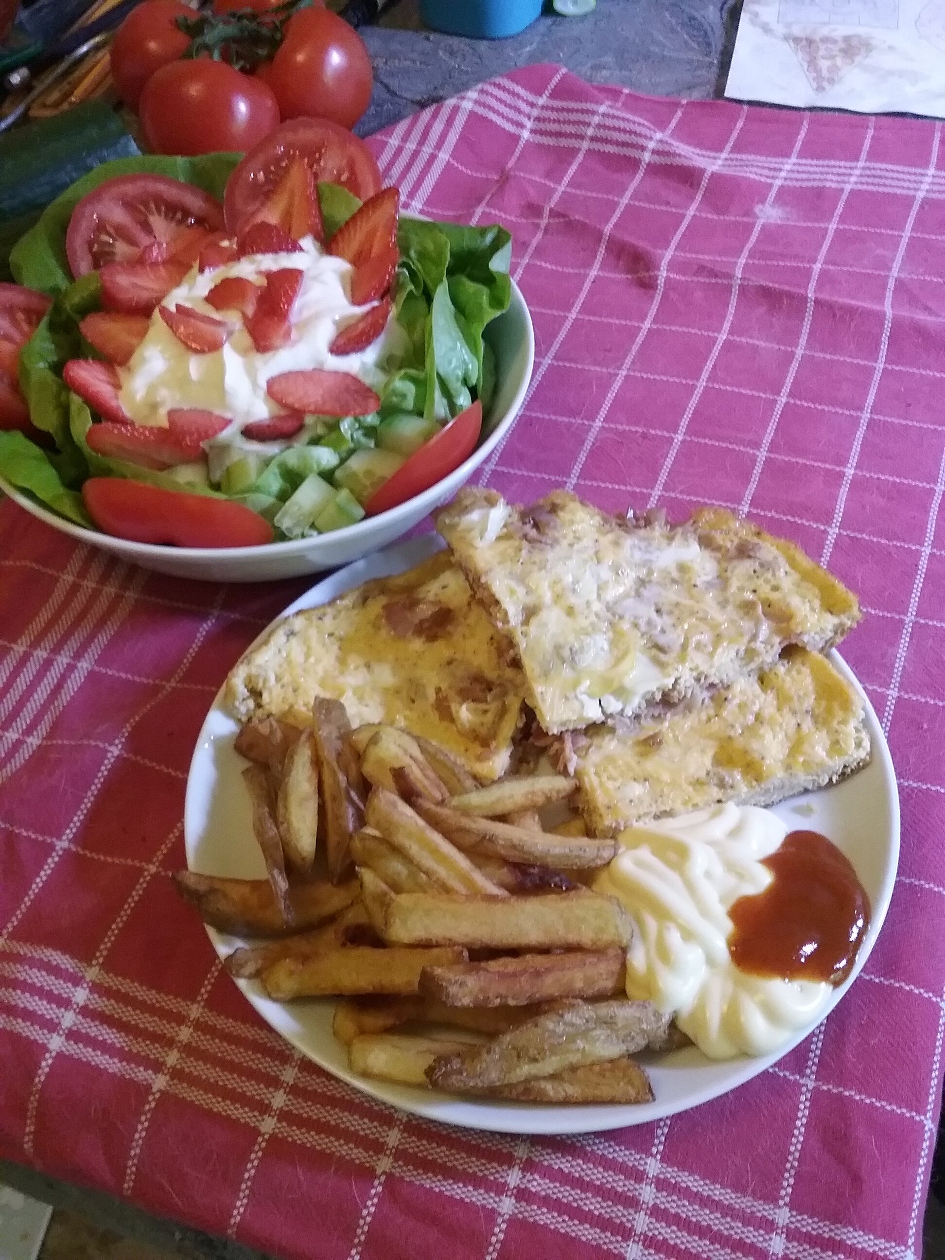 Hier aardappels sla en vlees vanavond