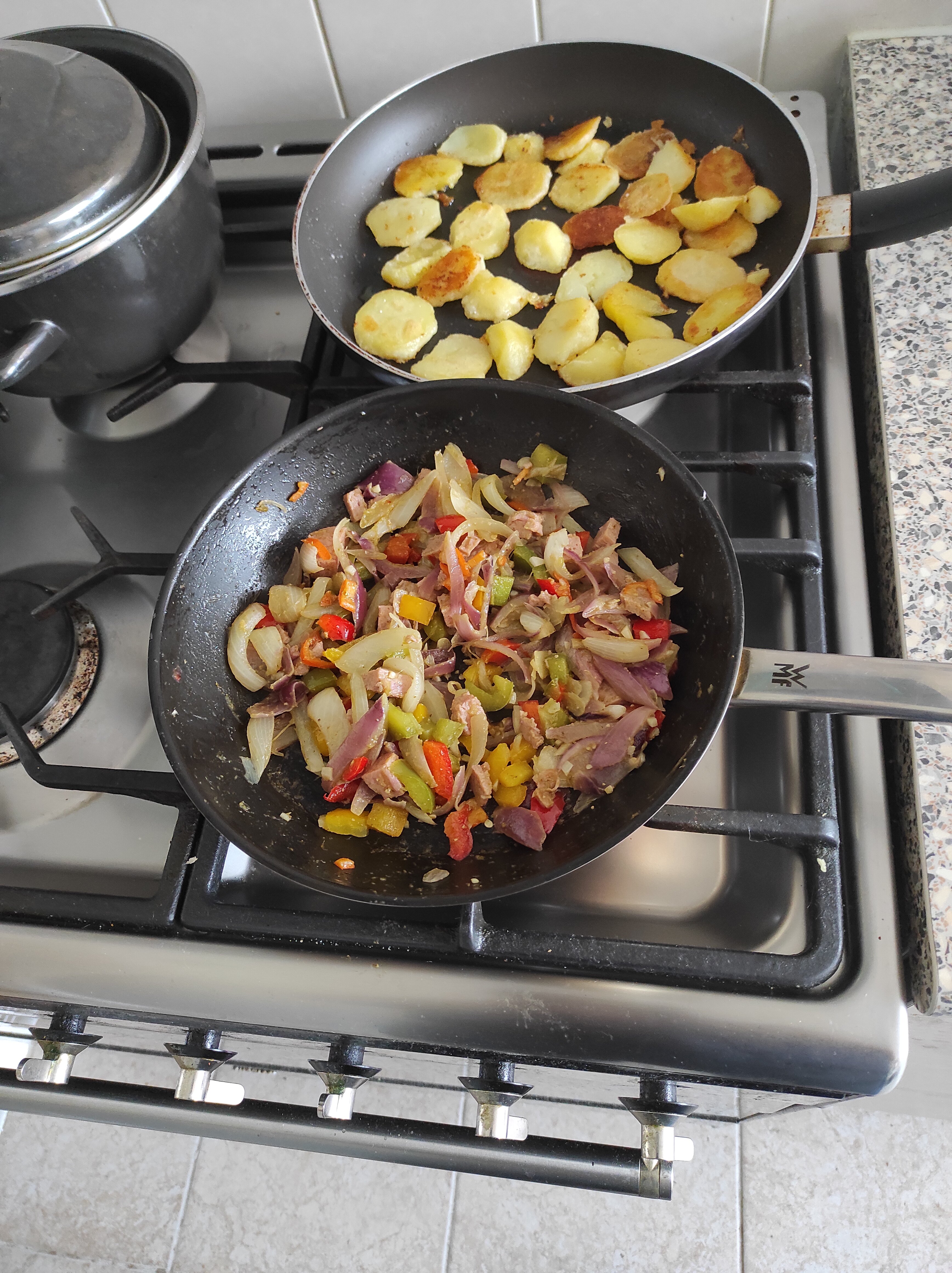 Gebakken aardappelen met mengsel van rode en gele uien met paprika en knoflook en pesto