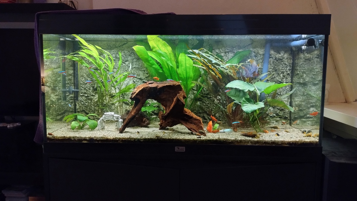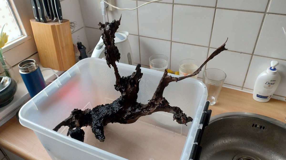 Ik ben heel benieuwd hoe het gaat met het verkleuren van het water. Het stuk hout stond in ca 25 liter water en elke week bij het verversen was het water geel. Het werd wel minder, maar hij bleef afgeven. Goede kans dat het water in het aquarium straks ook geel is. We gaan het zien.