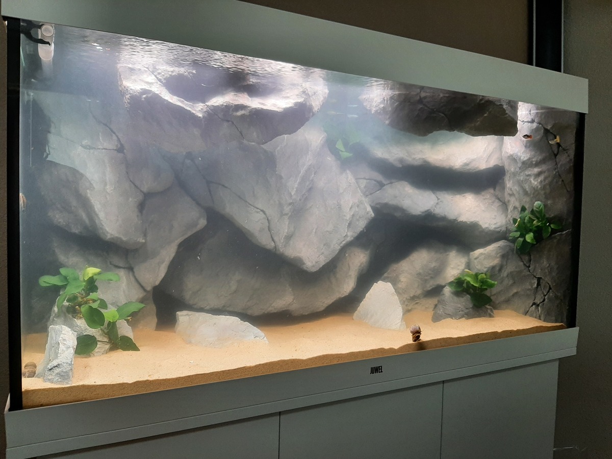 Ik heb er een Aquadecor achterwand in geplaatst met daarbij ook stenen voor op de bodem en overhangende rotsen.