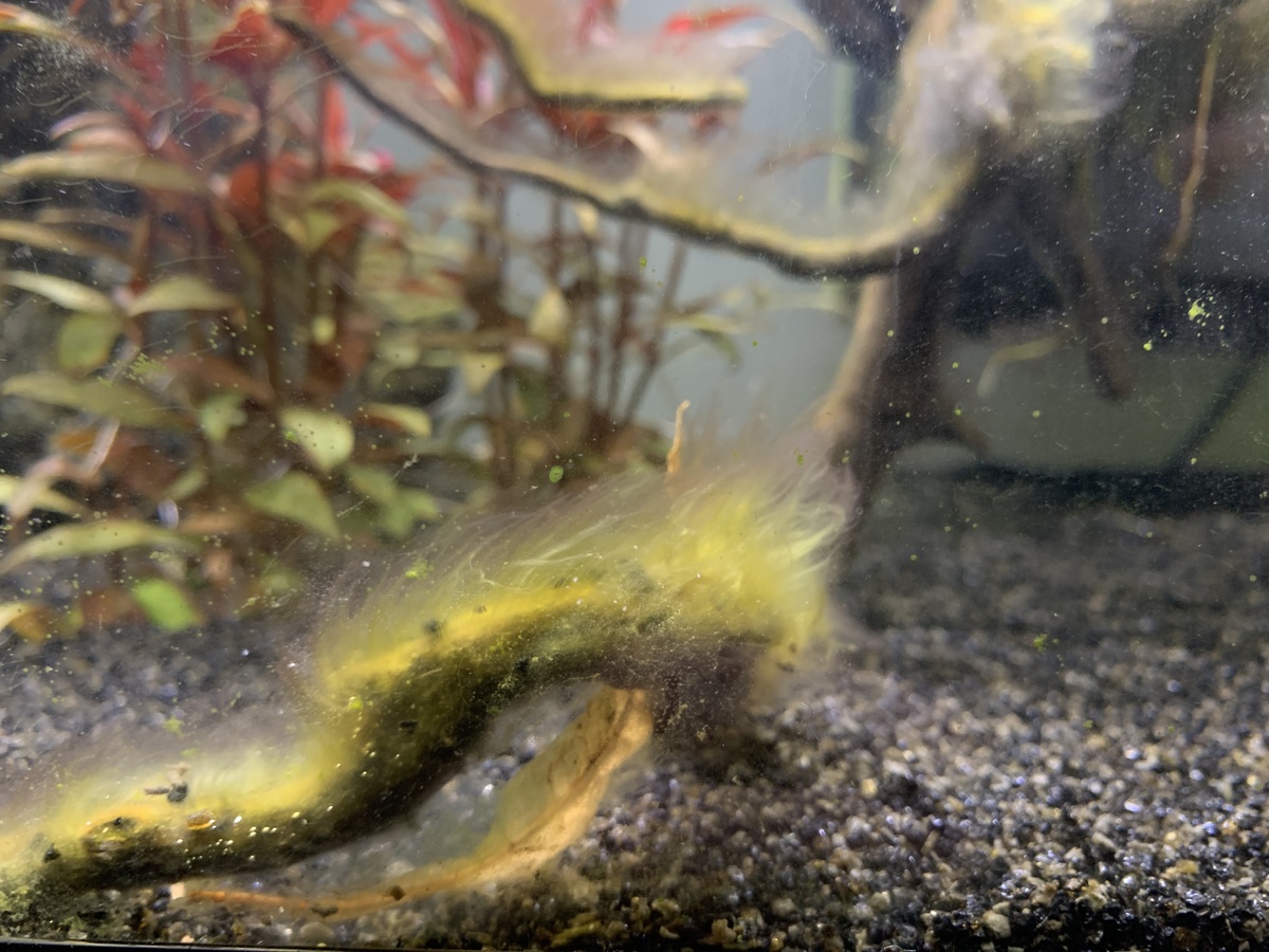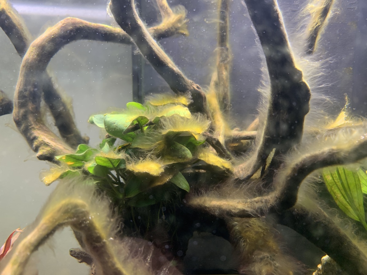 Nu hebben we te maken met een rare algvormging (nooit eerder gezien in ons klimaatje). Op de foto’s is deze duidelijk te zien op ons spiderwood, planten, stenen en zelfs op onze slakken. Ik denk zelf aan een soort baardalg, maar weet het niet zeker. Kan iemand mij vertellen welke alg dit is en advies geven hoe ik deze alg het beste kan bestrijden?