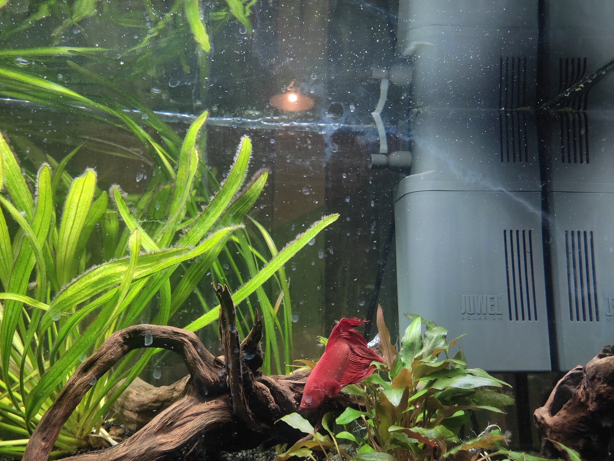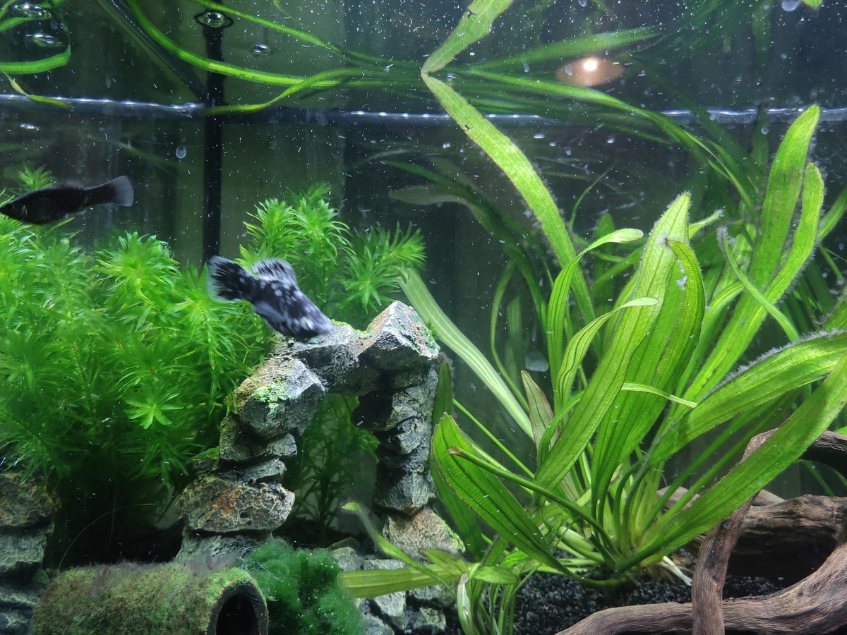Dit gaat goed en er zijn verder geen problemen tussen de Mollies en de Betta😀 heel soms gaat de Betta achter een molly aan maar dan alleen als ze hem lastig vallen in zijn tunnel. Of tijdens het voeren soms.