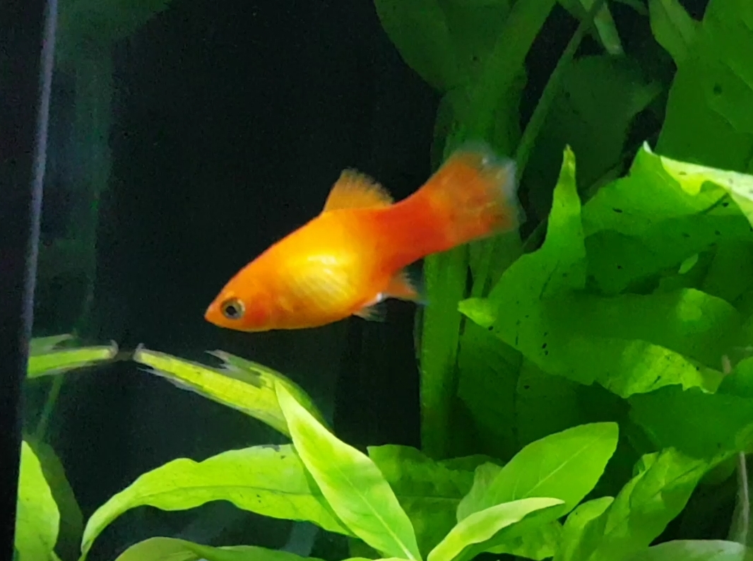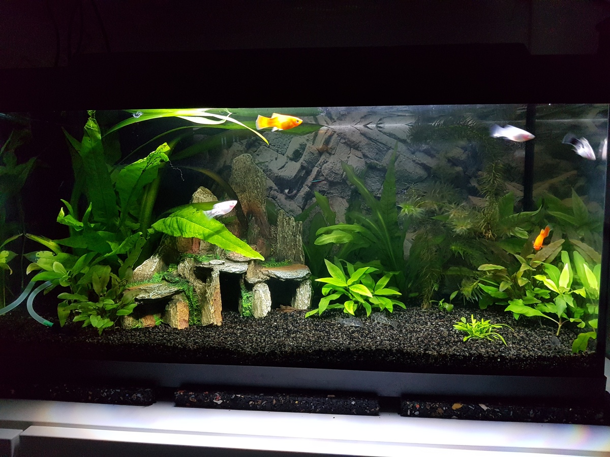 Ons vissenbestand is als volgt: 5 platy vrouwtjes. Waarvan 3 zwanger. 5 corydoras ik denk 3 vrouwtjes 2 mannetjes. En 10 kardinaal tetra's.