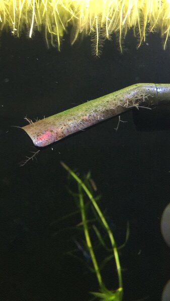 Denk dat het wel eens watercirculatie kan zijn. Paar weken overgestapt van luchtpompjes naar pat mini’s maar had hem niet heel hoog staan. Heb hem nu verder open gezet. Alg zit alleen op de uitlaat. Verder nergens in de bak