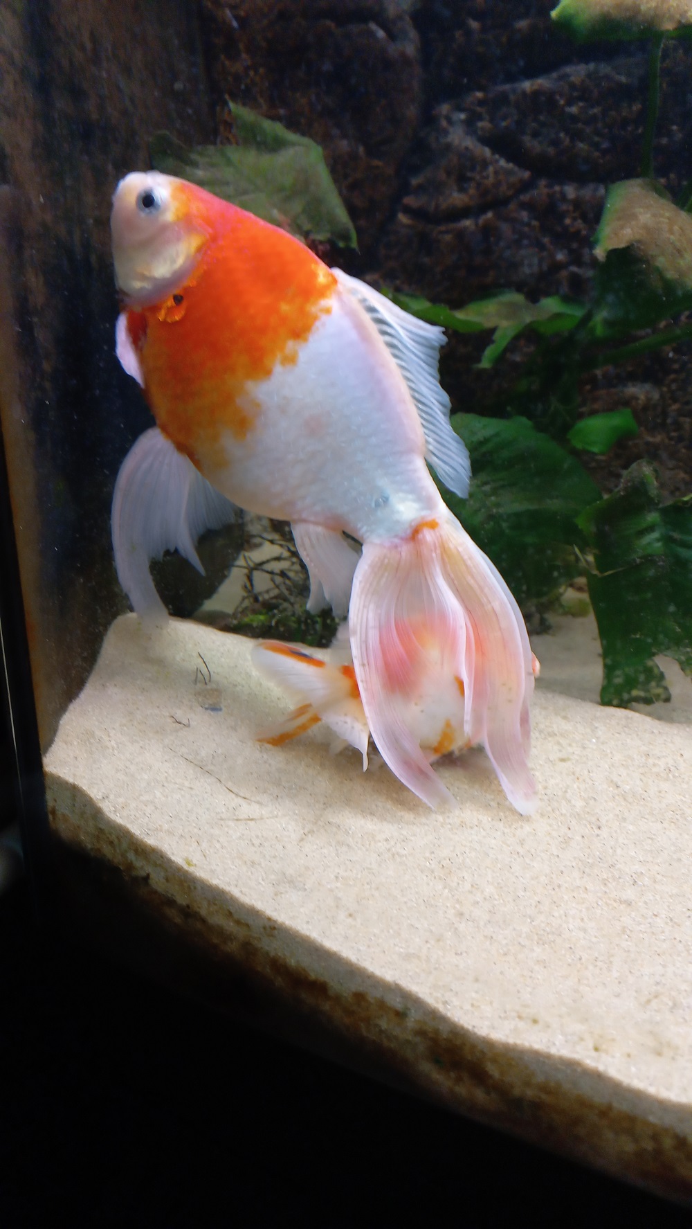 Ik heb er binnen een week 2 kleinere sluierstaarten bij gezet. Dat zijn ook 2 vriendjes. Ze zijn nu alledrie aardig gewend aan elkaar. Toch ziet het er niet heel goed uit.