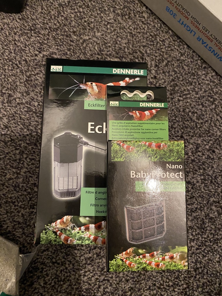 Ik heb nu de Nano Dennerle aquarium 30 liter gehaald met ander filter en speciaal klep voor mini garnaaltjes. Een andere LED lamp voor bovenop en grijs zand voor voor in het aquarium en zwarte korrels (die er nu in zitten) voor bodem voor de planten. Nu dan een wat hogere zwarte korrel bodem voor planten achter en het zand lagere bodem voor toch?